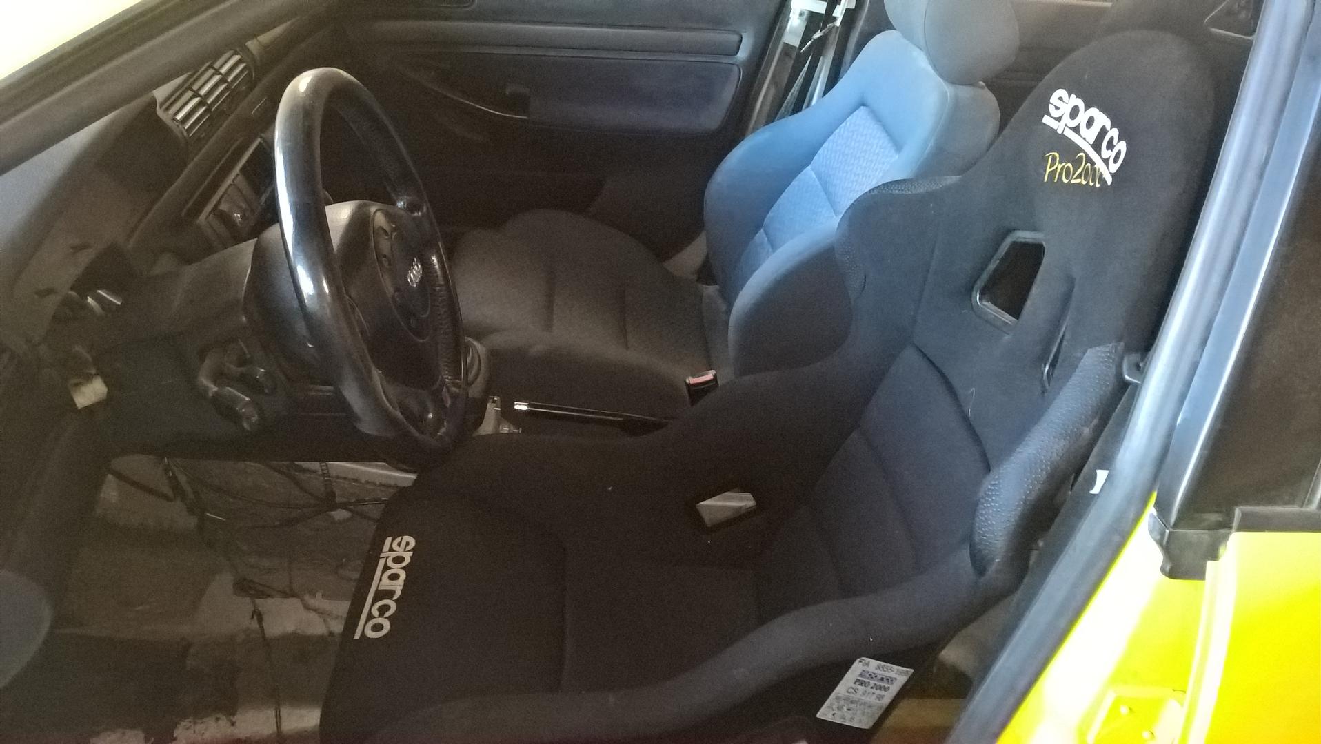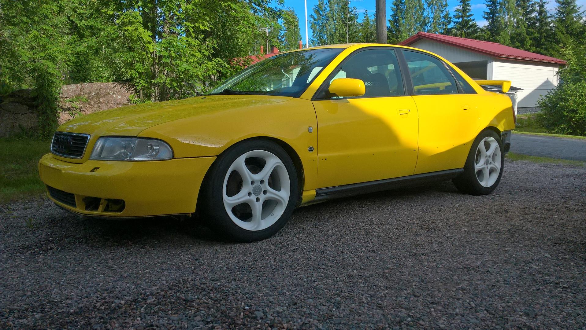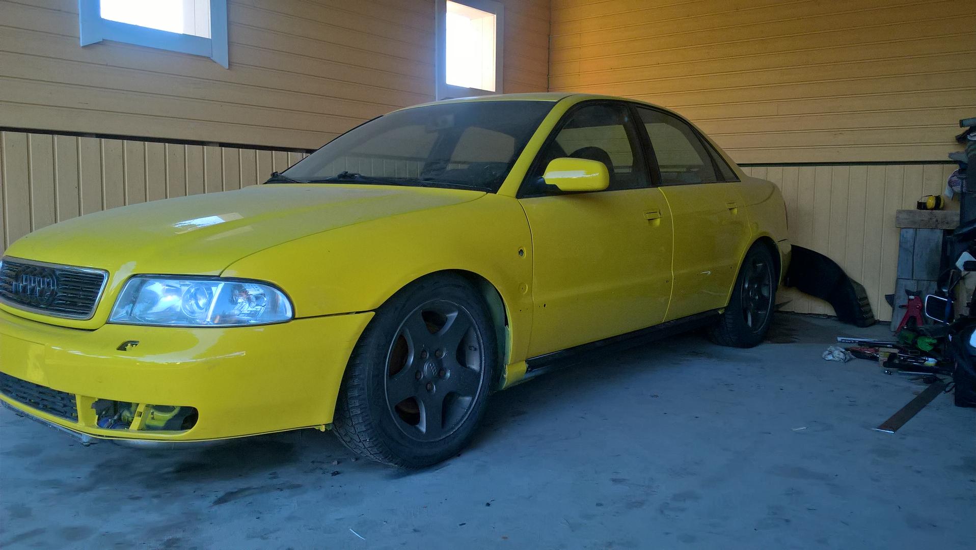 Talvella tuli tontille keltaiseksi ylimaalattu karvalakkimallinen A4 sedani. Sisusta oli jo valmiiksi purettu pois. Alustasarjana joku säädettävä kiinamalli. Mukana tuli koneeseen osia kuten kankisarja, pakosarja, hukkaportti, vauhtipyörä, nokka-akselit, jne. Mukana oli myös penkit, ratti, RS3 jarrut levyineen eteen ja taakse jotkut perusmallit. Etupään nivelet näytti remontoidulta. Hankintalistalle jäi kytkin, pakoputki ja välijäähy, jotka löytyivät foorumilta. Turbokin oli mukana, mutta hommasin Holsetin HX35/40 hybridin tilalle vähän paremmin konseptiin sopivan Fin-Turbon KT 54/57/0,82, kun sattui sekin olemaan foorumilla ja myyjä vakuutteli sen olevan just tarkastettu/huollettu.