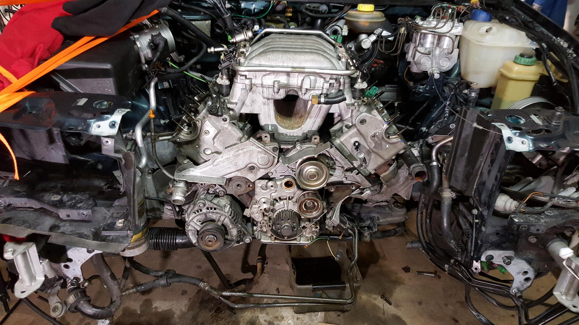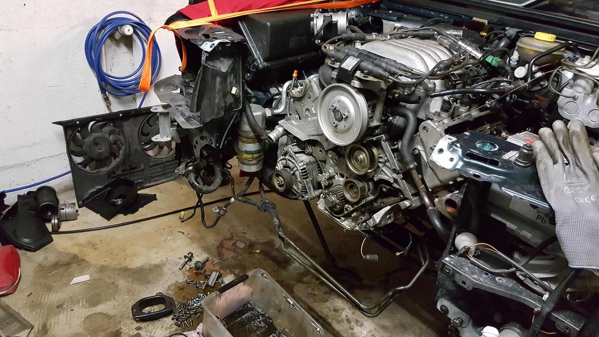 Tässä nyt sellaisia parin-kolmen tunnin iltavuoroja päässyt tämän kanssa tekemään tällä viikolla. Nyt olisi purkua jäljellä laturin ja startin irrotus, pakosarjojen ja alkuputken välin avaaminen, vetolevyn pulttien irrotus ja noin puolet koneen ja vaihteiston välisistä pulteista. Sit vaan koneen kannakkeet irti ja motti pois. Ei oo omaa norsua niin menee varmaan viikonlopulle että saan kaverilta lainaan.