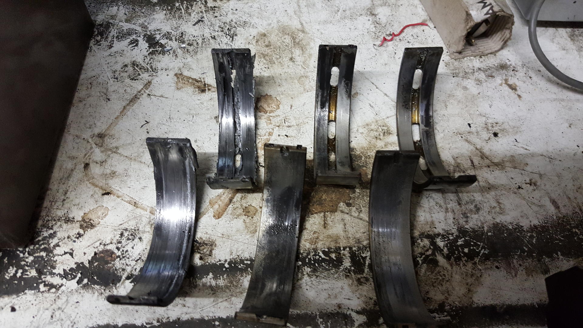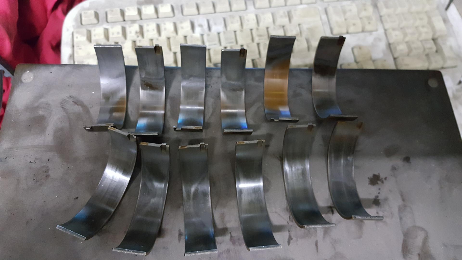 Ekat neljä kuvaa on kampuran kauloista heti runkolaakerien irrotuksen jälkeen. Seuraavat kolme kun hiukan liinalla pyyhin mitä irti lähti ja viimeinen kuva ensimmäisestä laakeripukista, muut pukit aivan hyvän näköisiä. Kampiakselissa ei kynnellä tunnu mitään pykälää. Kaksi viimeistä kaulaa on aivan kiiltäviä, edestä katsottuna toinen on hiukan naarmuisen näköinen ja ensimmäinen sitten kaiken pahin. Nuo kaksi ensimmäistä kaulaa näkyvät yhteiskuvassa.