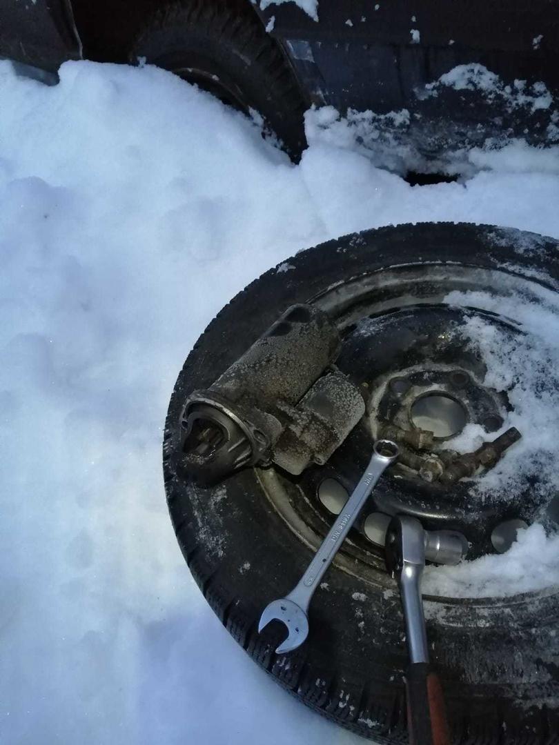 Tänäänpä ei sitten varaosakauppias vastannut puhelimen ja pakkastakaan ei ollut, kuin - 8 C, joten takaisin varaosa-auton kimppuun. Sieltä se startti loppujenlopuksi irtosi, kun sai renkaan irti jäästä ja autoa tunkattua ilmaan jonkuverran.