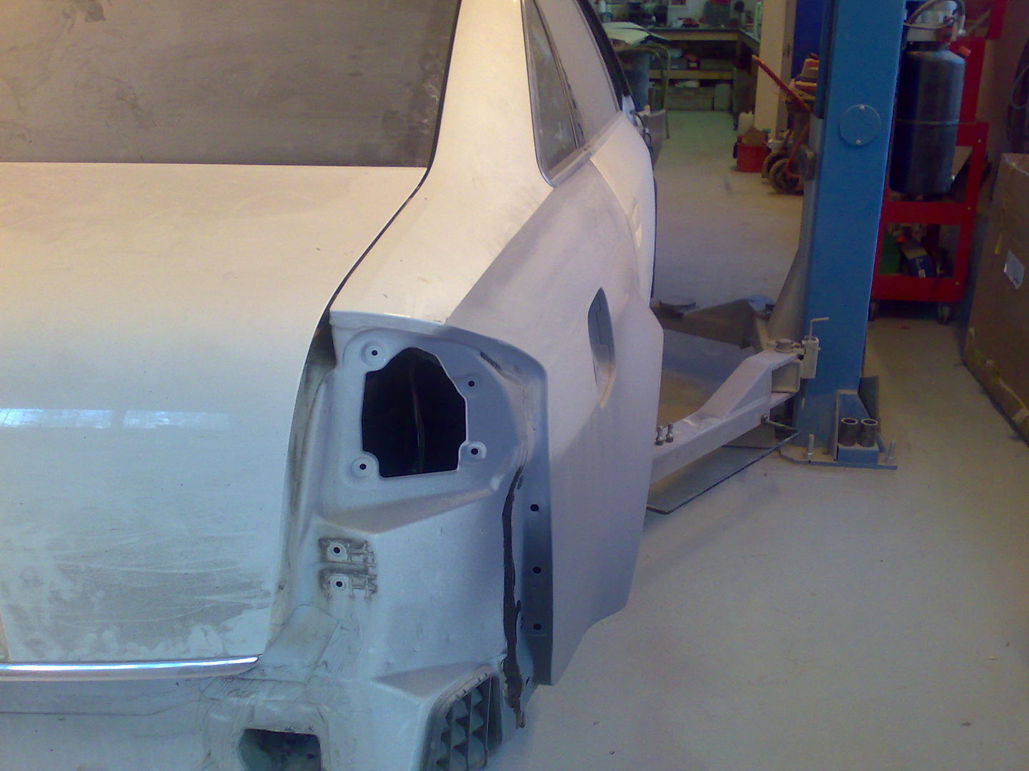 Takaluukun siloittelun jätin tällä kertaa väliin, sumuvalokehykselle vaan pitää miettiä jotain muutoksia. Maalauksen jälkeen auto saa mennä talliin odottamaan kevättä. Talvella sitten vanteet saa värinsä, joka vielä hieman auki. Mutta tuossa joku kuva mikä tilanne oli eilen maalaamolla. Nätisti ne kylkipalat siihen istahti.