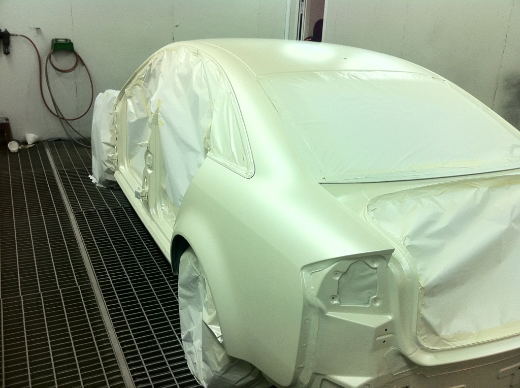 Kori maalattu ja lakattu. Ensi viikolla väriä saa ovet, konepelti, takaluukku, puskurit ja helmat. Pientä hiomista ja sen jälkeen koko paketin maalaus ja lakkaus kertaalleen tasaisen värin saamiseksi. Tuossa muutama kuva miltä se suurinpiirtein näyttää, loput kuvat keväällä kun koko paketti kasassa vanteita myöten ja ammattitaitoisemman kuvaajan valokuvaamana. Tokassa kuvassa väri taittaa epätodelliseen kun maalauskammiossa kuvattu.