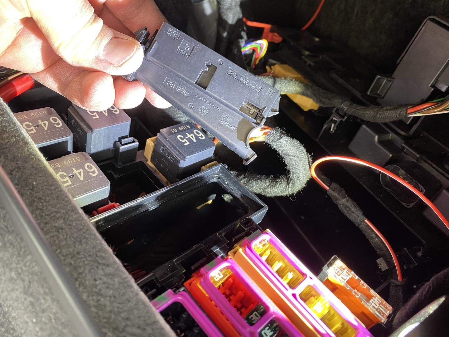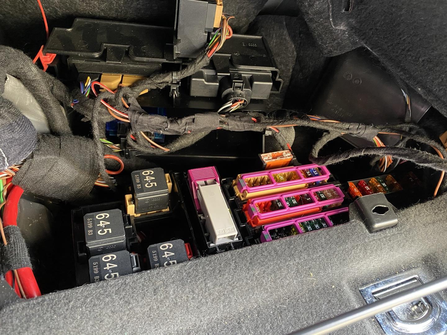 Active Sound – asennus jatkuu. Sound Module asentuu alkuperäiselle paikalle takakontin oikeaan sivustaan, ja kaikki tarpeelliset kytkennät voi tehdä helposti siinä lähettyvillä; CAN-kytkennät CAN-disconnectorin kautta, virta sulakerasialta alkuperäiseltä kohdalta ja maa, no maahan. Kufatecin moduulille löytyy myös hyvin asennuspaikka, ja kiinnitys velcro-tarralla. Takapöntölle menevä johdotus sisäkautta auton vasemmalle puolelle, josta läpivientikumin kautta suoraan takapöntölle. Vanhan takapöntön poisto alkaa tarkastelemalla ja merkitsemällä oikea leikkauskohta, ja varsinainen leikkaus sujuu vaivattomasti ketjuputkileikkurilla. Alkuperäinen putkisto on 56mm, ja BiTDI-takapönttö 60mm, joten tähän väliin tarvitaan putkiadapteri. Kiinnitys pakoputkikiinnikkeiden avulla, ja näin takapönttö on jatkossakin helppo tarvittaessa irroittaa.