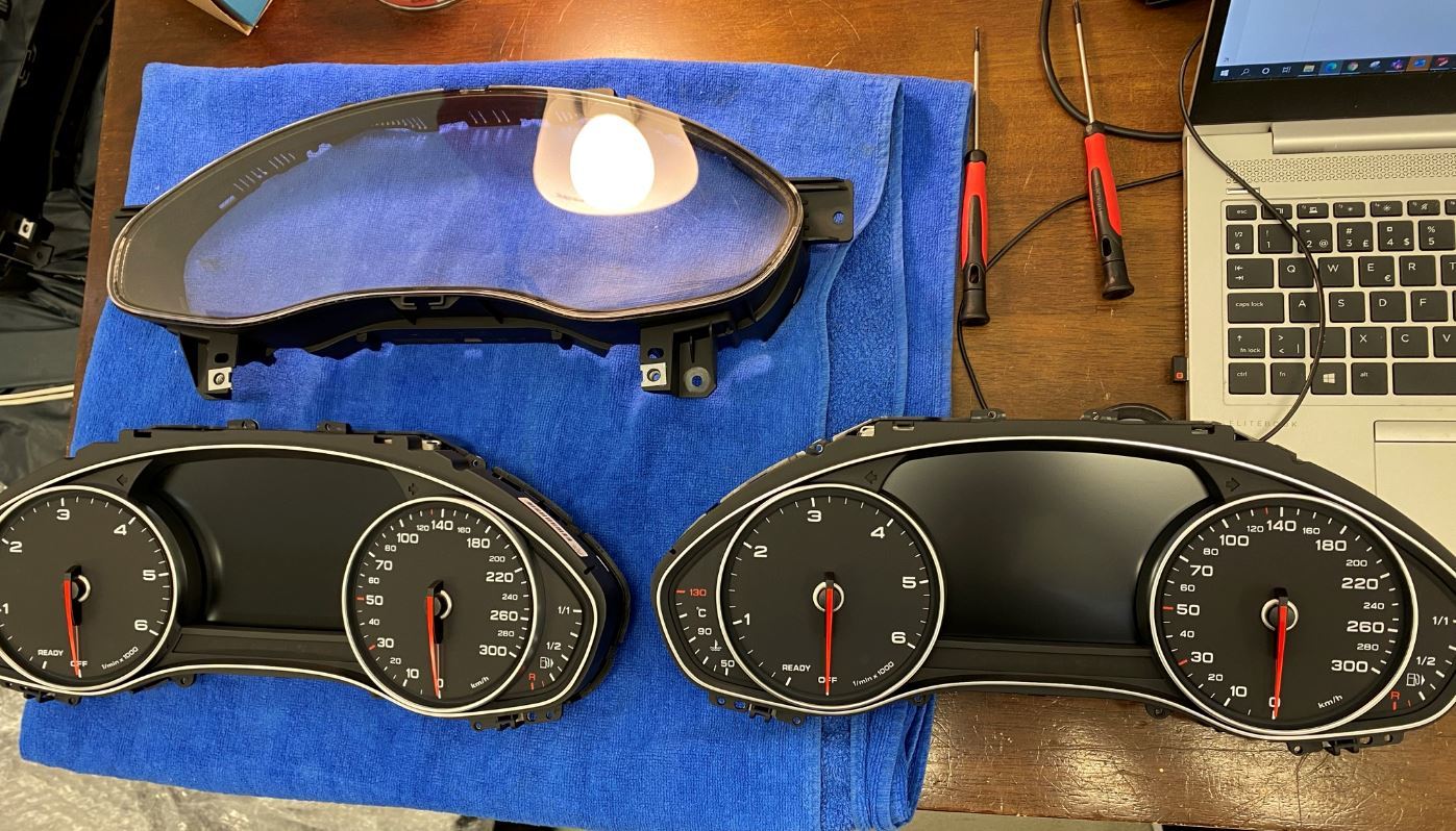 Night Vision projekti alkoi heti mielenkiintoisesti, koska selvittelyssä kävi ilmi, ettei nykyinen mittaristo (H-loppuinen) tue Night Visionia. Oikean mittariston löytäminen käytettynä oli todella hankalaa, mutta lopulta Hollannista löytyi sopiva mittaristo (J-loppuinen)! Pieni kauneusvirhe oli, että mittariston lasi puuttui, mutta sen sain onneksi sopivasti siirrettyä vanhasta mittaristosta. Samalla vaihtoon meni valokatkaisin, koska NV-kytkin on valokatkaisimessa. Tässä samalla korjaantui A6/A7 -mallien yksi pienistä tyyppivioista, eli irronnut kirkkaudensäätönappi. Nämä irtoilevat/rikkoutuvat ilmeisesti polvella osuttaessa?