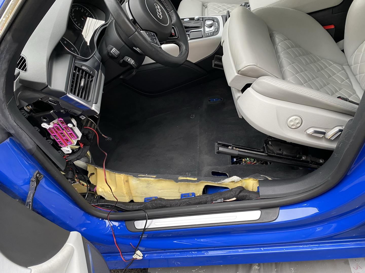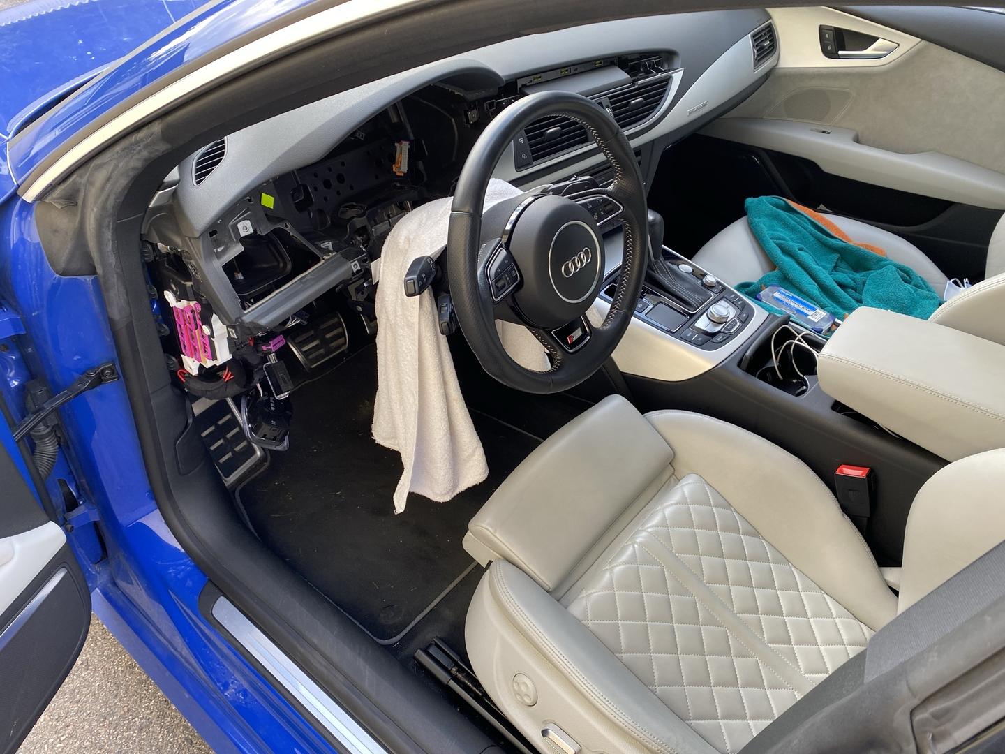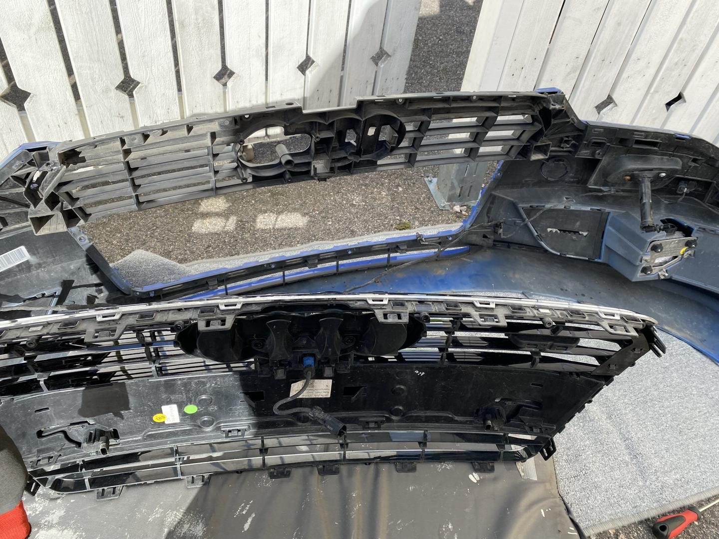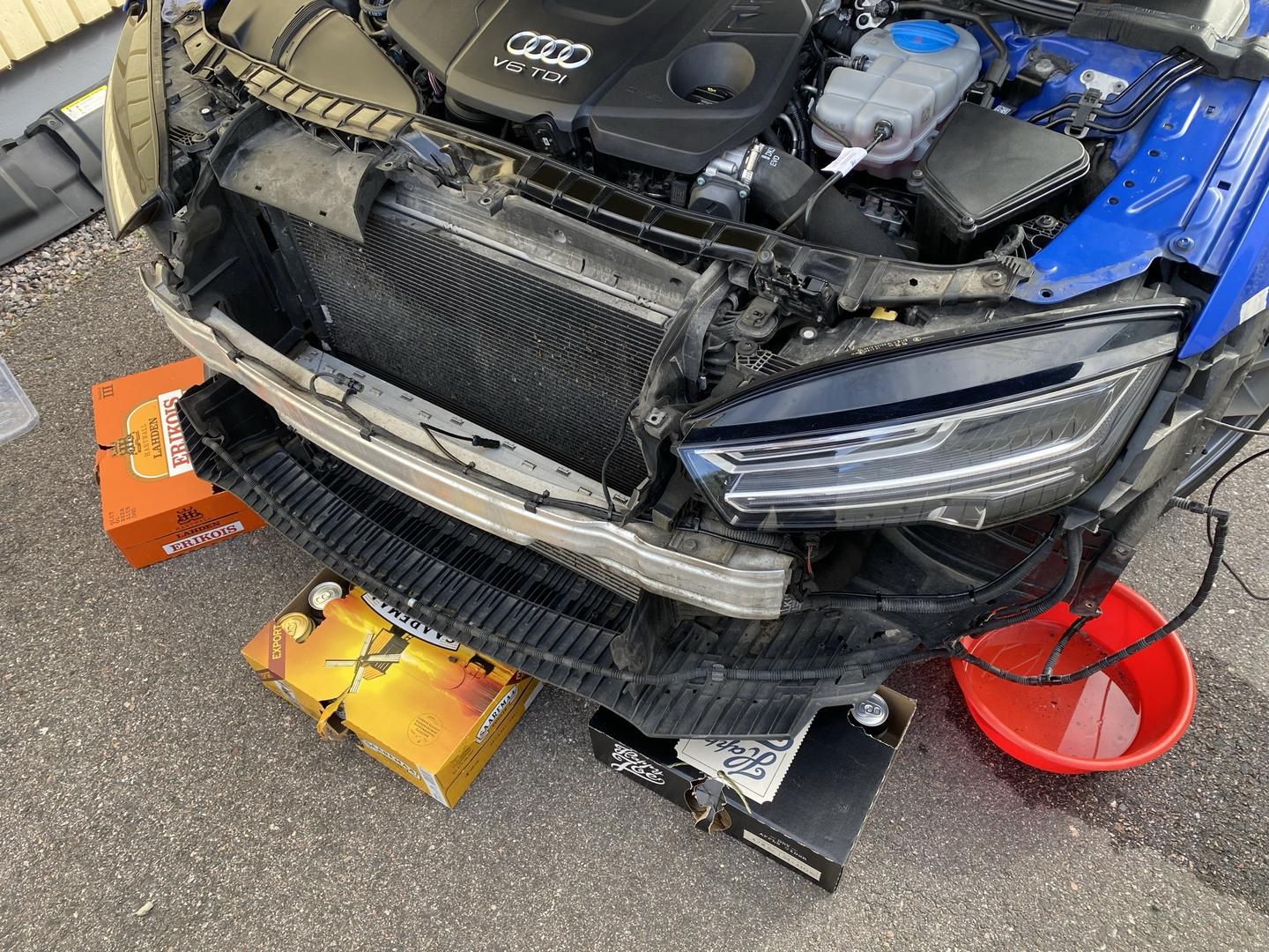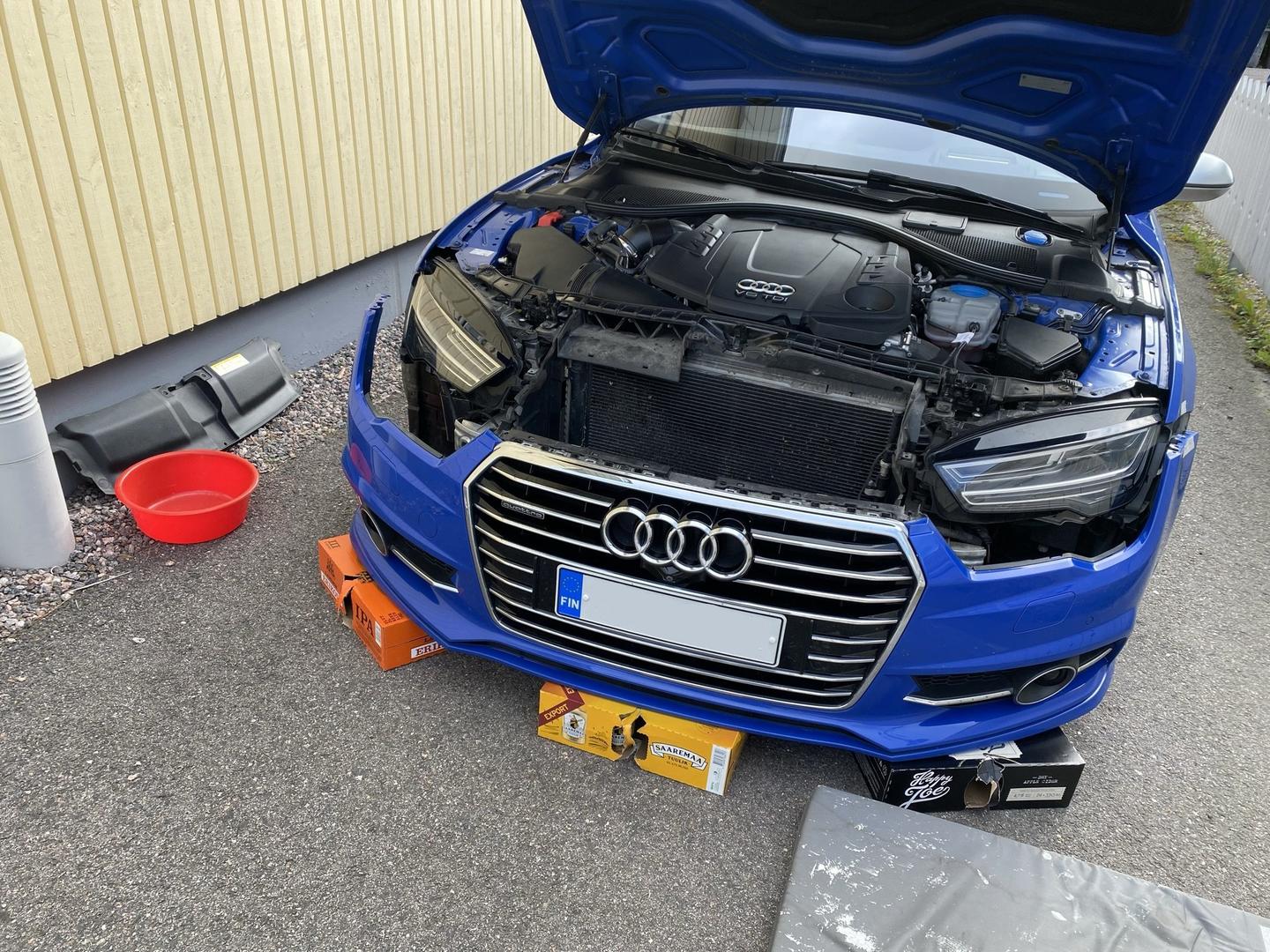 Kameran asennusta varten Audi-merkin pidike tulee vaihtaa versioon, jossa on reikä kameralle ja pesurille. Tätä varten koko puskuri tulee irroittaa ja maski purkaa, koska Audi-merkin pidike on maskin/grillin sisällä. A7-mallin puskuri on onneksi todella helppo irroittaa. Kannattaa kuitenkin huomioida, ettei käytä autossa virtoja päällä, koska ACCn tutkat ovat kiinni puskurissa ja saattavat ottaa vikakoodit (ja vaatia kalibroinnin), jos virrat kytketään puskurin ollessa irti.