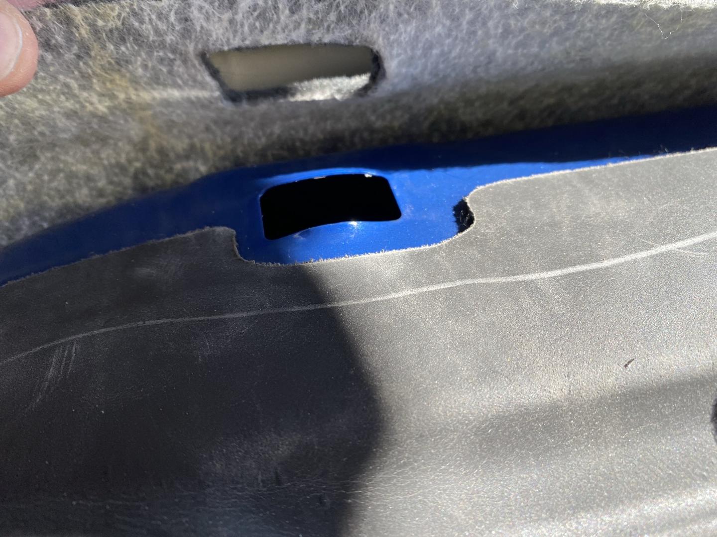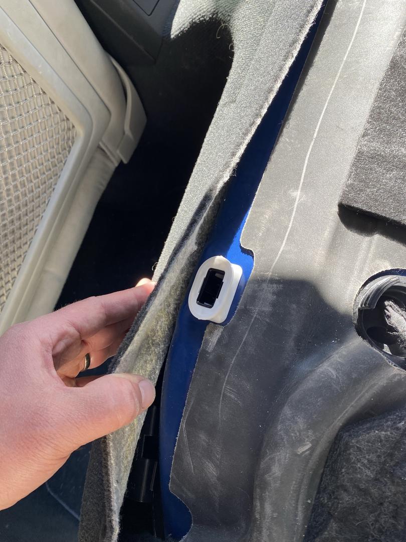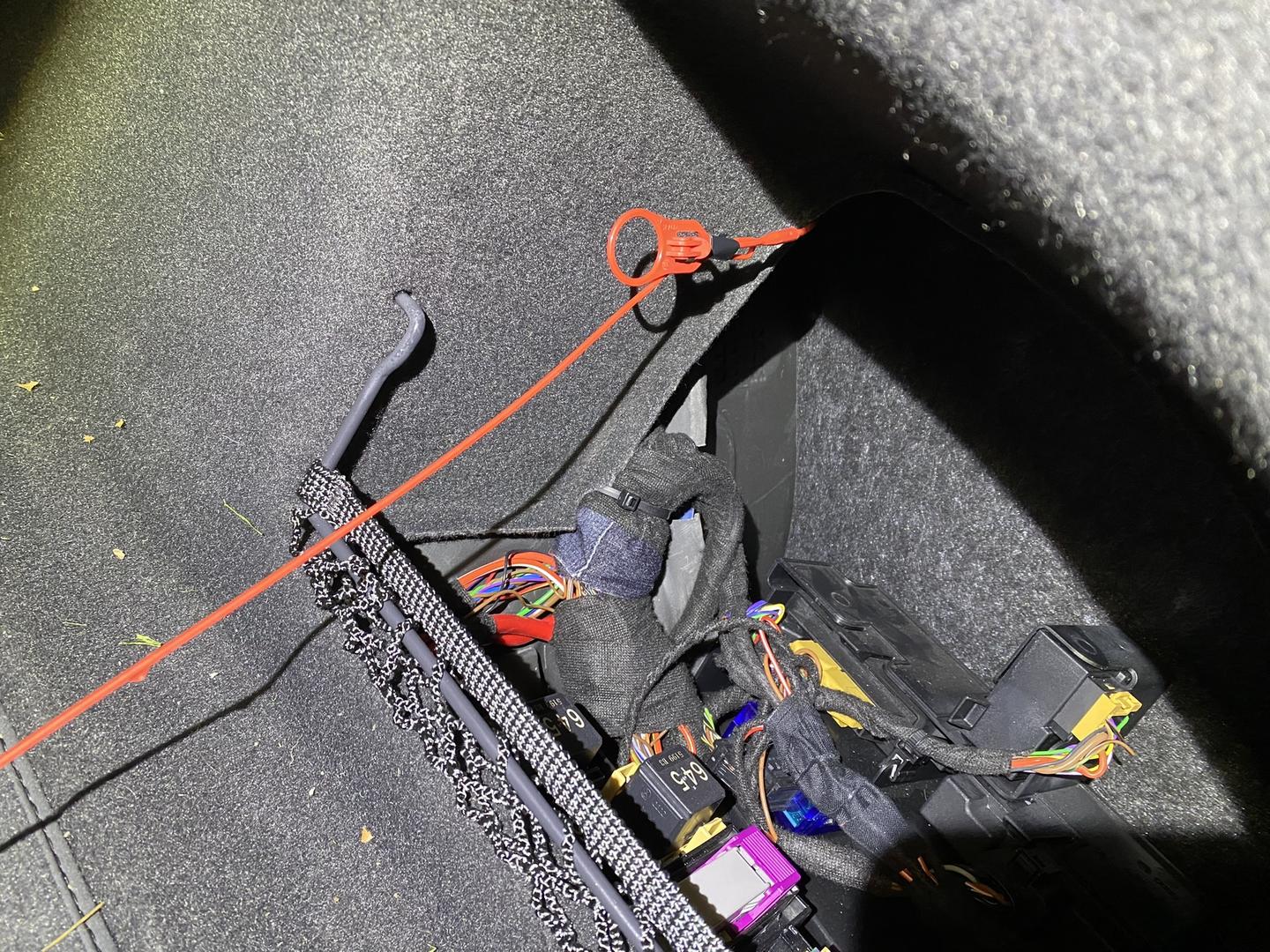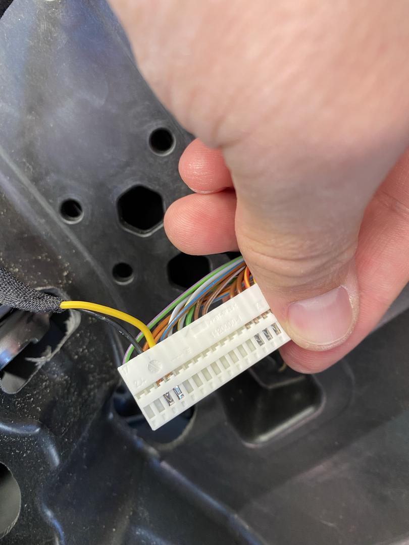 Itse lukitusmoottorin vaihto on helppo; kaksi torxia auki ja liitin irti. Tässä kohtaa kannattaa irroittaa myös ”hätäkatkaisin”-vaijeri vanhasta lukitusmoottorista, sitä voi käyttää uuden vaijerin läpivientiin takakontin sivustaan.
