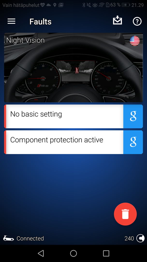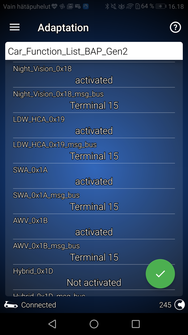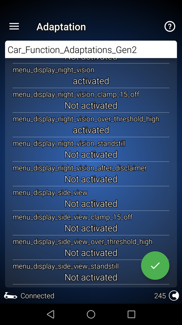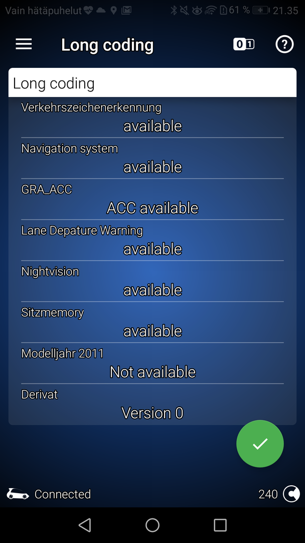 Koodausten jälkeen NVn vikakoodit ovat vielä odotetut eli Component Protection ja ”No basic setting” eli kameran kalibrointi tarvitaan. Hyvä merkki oli, että vikakoodit poistamalla sai lyhyesti oikean kuvan vilahtamaan mittaristossa (1-2 sekuntia) ennen vikakoodien/virheilmoituksen uudelleenilmestymistä, ja tästä tiesi johdotuksen jne. olevan kunnossa.