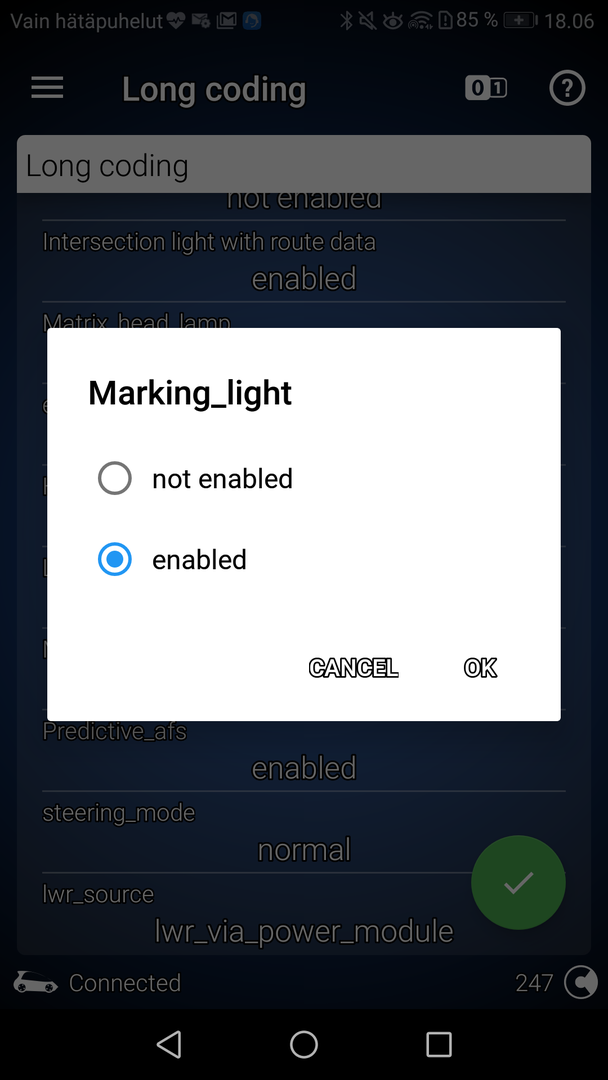 Matrix valoille koodattiin ”marking light” päälle, eli ominaisuus jossa NV-järjestelmä osoittaa valoilla kohteen (3 nopeaa vilautusta). Matrix valoja koodatessa on hyvä huomioida, että käytännössä mikä tahansa muutos/koodaus moduulissa 55 tuottaa ”no basic setting” vikakoodin valoille, jolloin esim. automaattipitkät eivät toimi. Tämän saa poistettua valojen kalibroinnilla.
