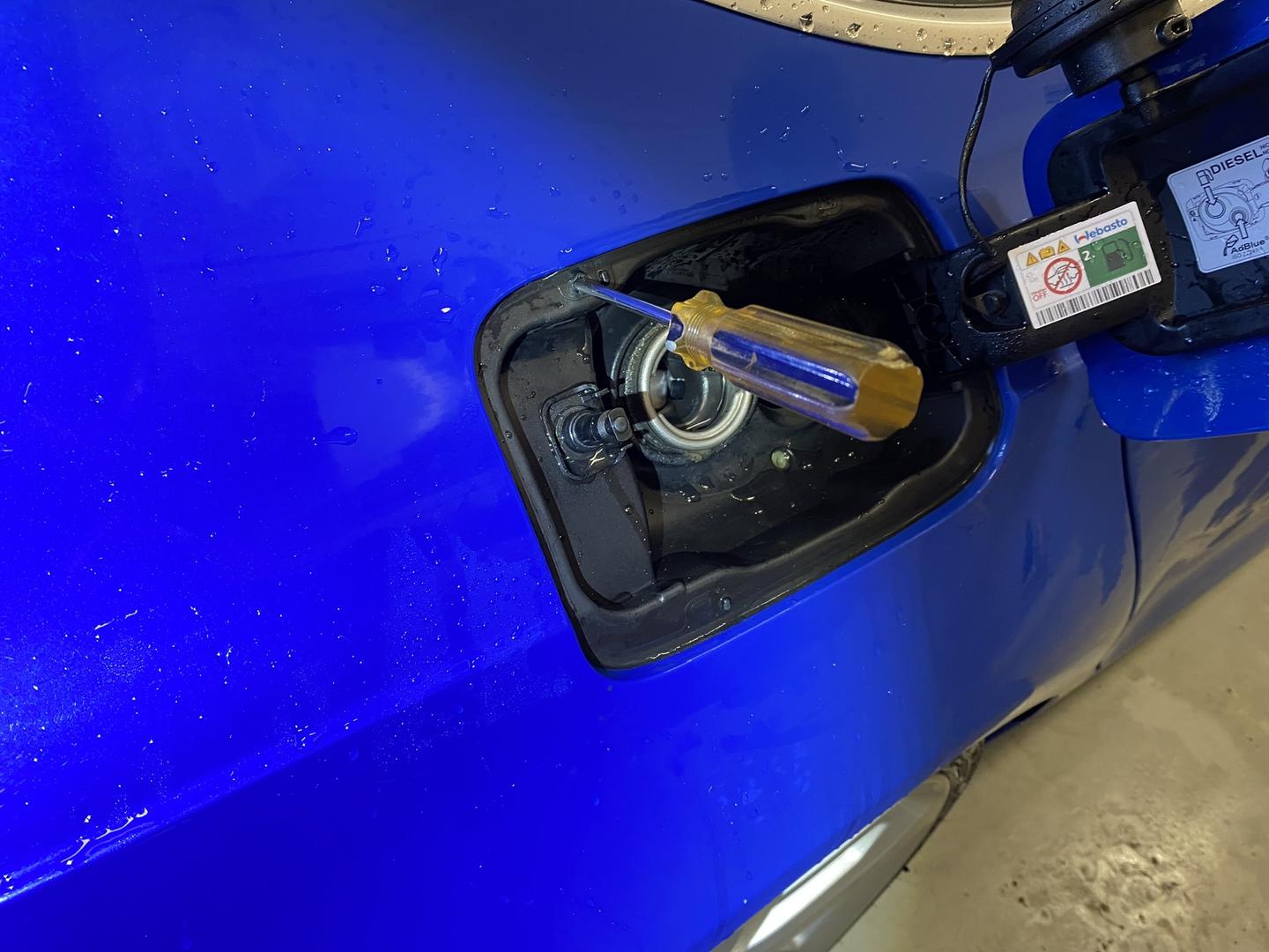 Koska päädyin vaihtamaan koko luukkuosan, irroitin myös tankin luukun kannen vanhasta osasta. Haastavin osuus oli vedenpoistoletkun vetäminen, koska se täytyy käytännössä vetää tankilta lokasuojan kautta alas (eli letkua ei voi jättää paikoilleen vaan se täytyy irroittaa ja asentaa uudelleen).