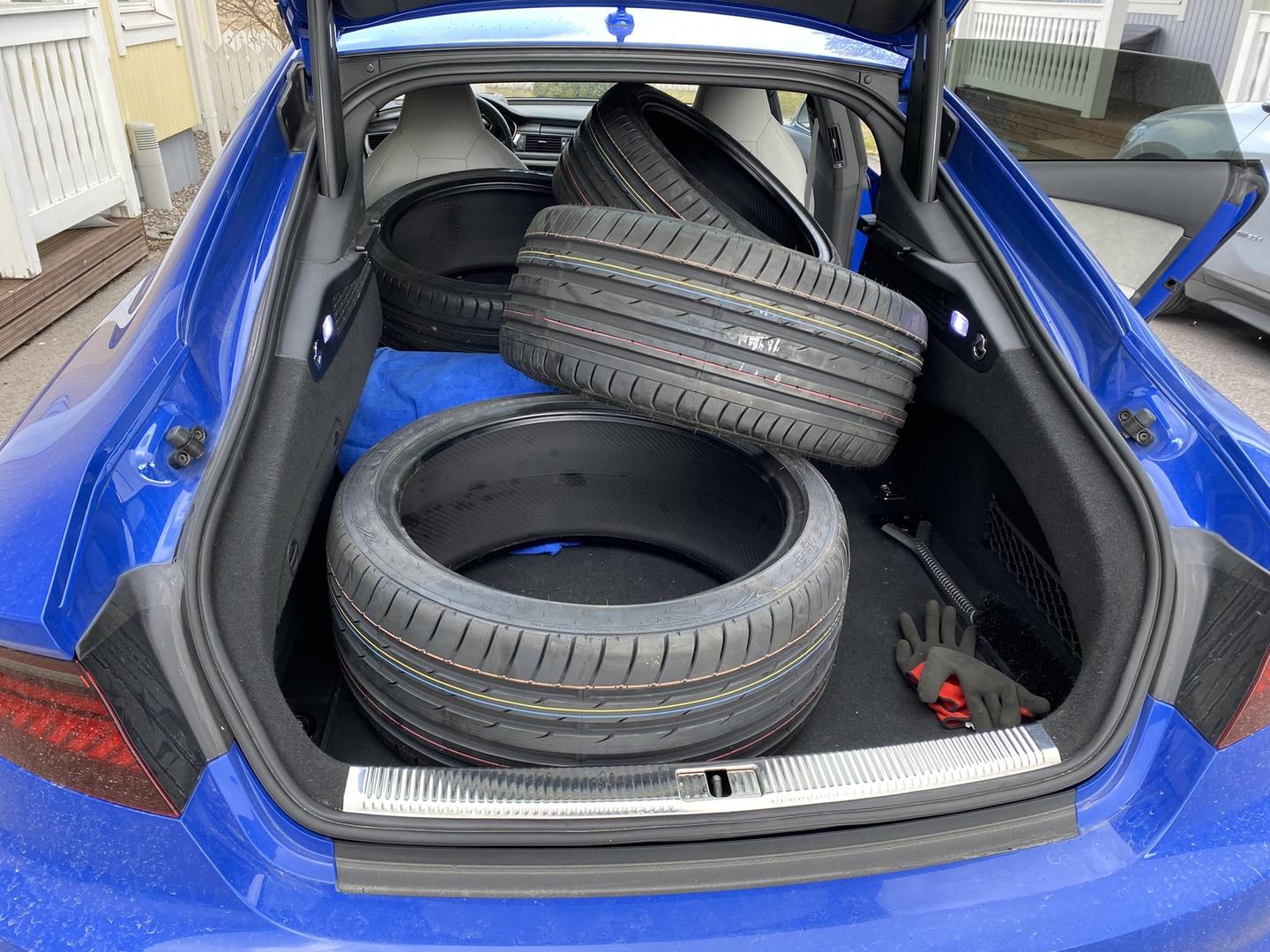 • Kesä tulee ja kesärenkaat tuli vaihdettua jo vähän aikaa sitten alle. Itse renkaat alkoivat olla uusinta-kunnossa, joten vaihdettiin nyt myös uudet kumit samassa alkuperäisessä koossa (265/35/20).