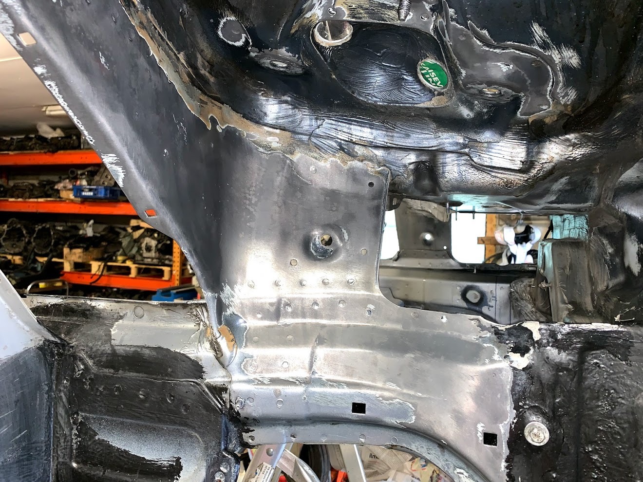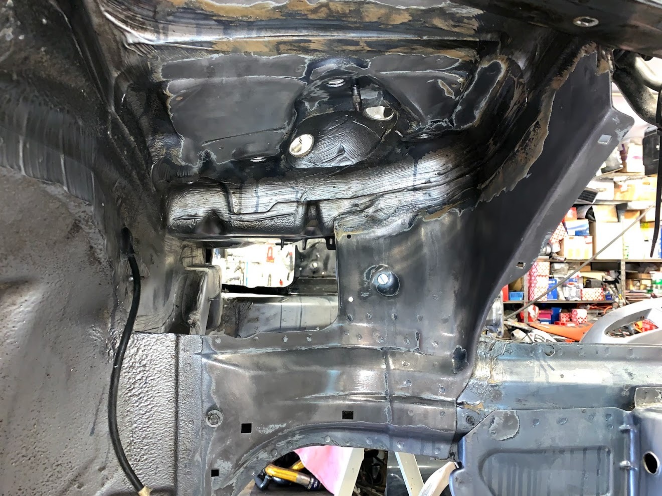 Purin konehuoneesta kaikki muut pois paitsi ilmastoinnin osat, koska en halunnut päästää kaasuja taivaalle. Samalla sitten purin myös kojelaudan irti. Rakensin eteen "apupyörät" jotta sain apurungon pois tieltä. Etupäähän meni noin kolme litraa epoksia, luulisi riittävän. Monessa beevitosessa on jostain syystä nuo pistehitsien kohdat alkaneet ruostumaan, muualla ei ole ollenkaan ruostetta. Takalokarit sai saman käsittelyn, hiontaa, happoa ja epoksia. Sitten päälle kiveniskumassa.