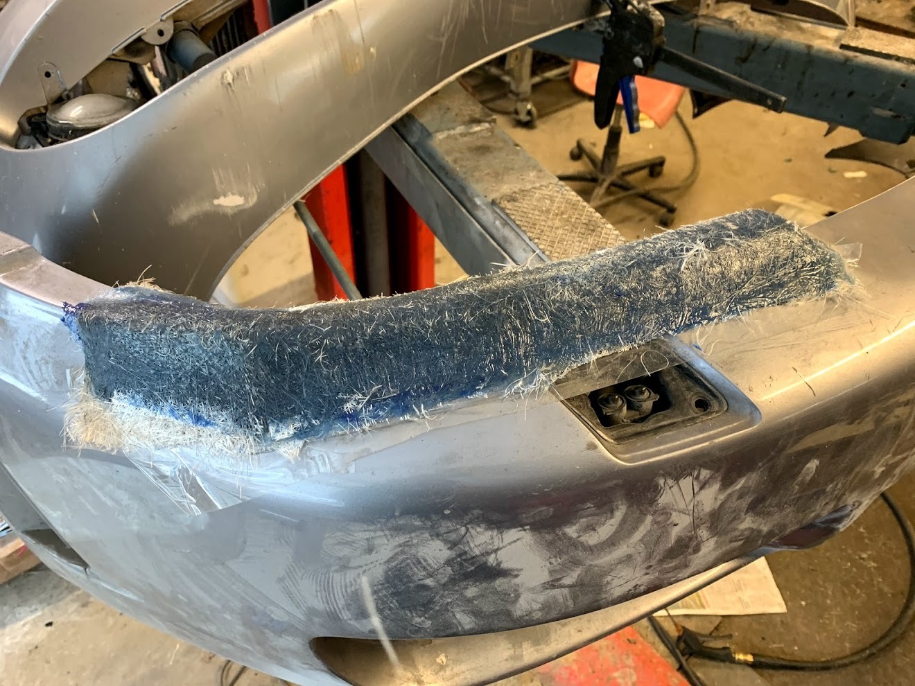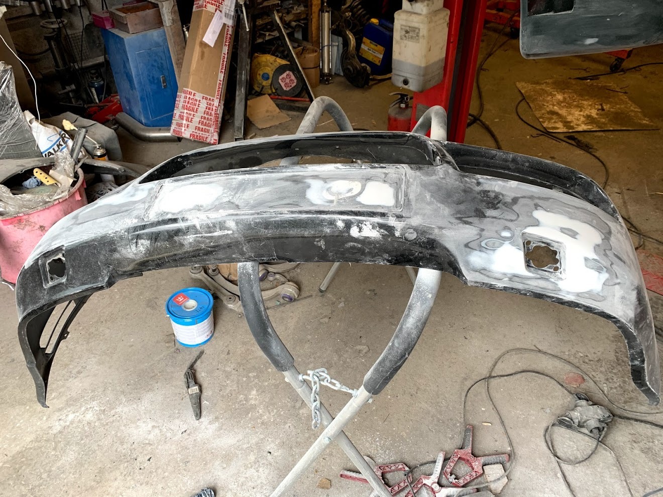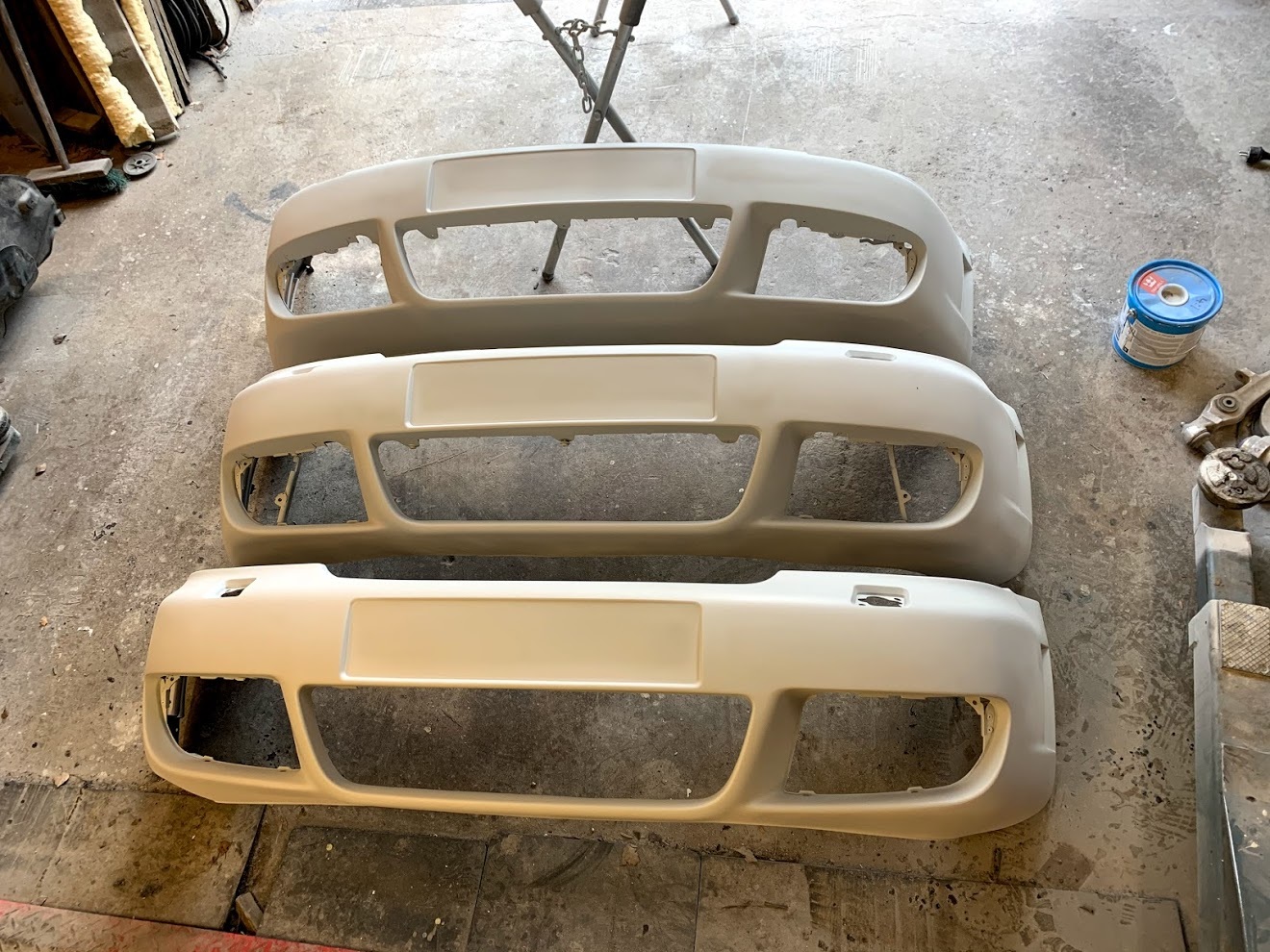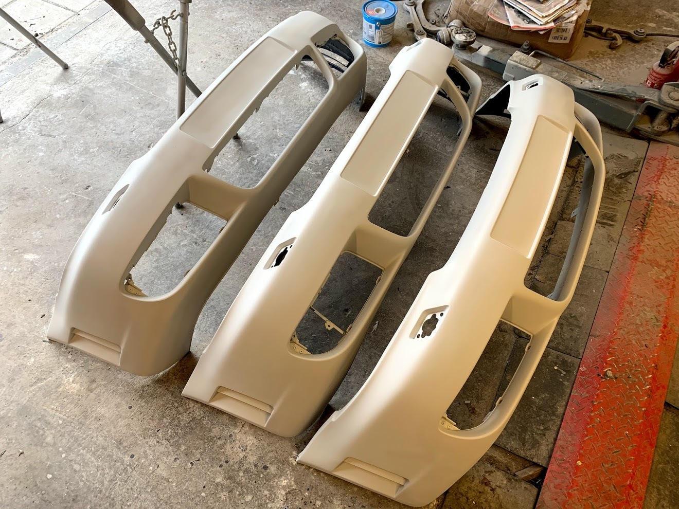 Joku pyytää jenkeissä ehjästä puskurista 3250$, eikä nämä saksassakaan ole halpoja saati helppoja löytää joten ne kannattaa korjata. Ja onpahan varaosia. Tein kolme puskuria maalausvalmiiksi, kolme muuta saa olla rauhassa.