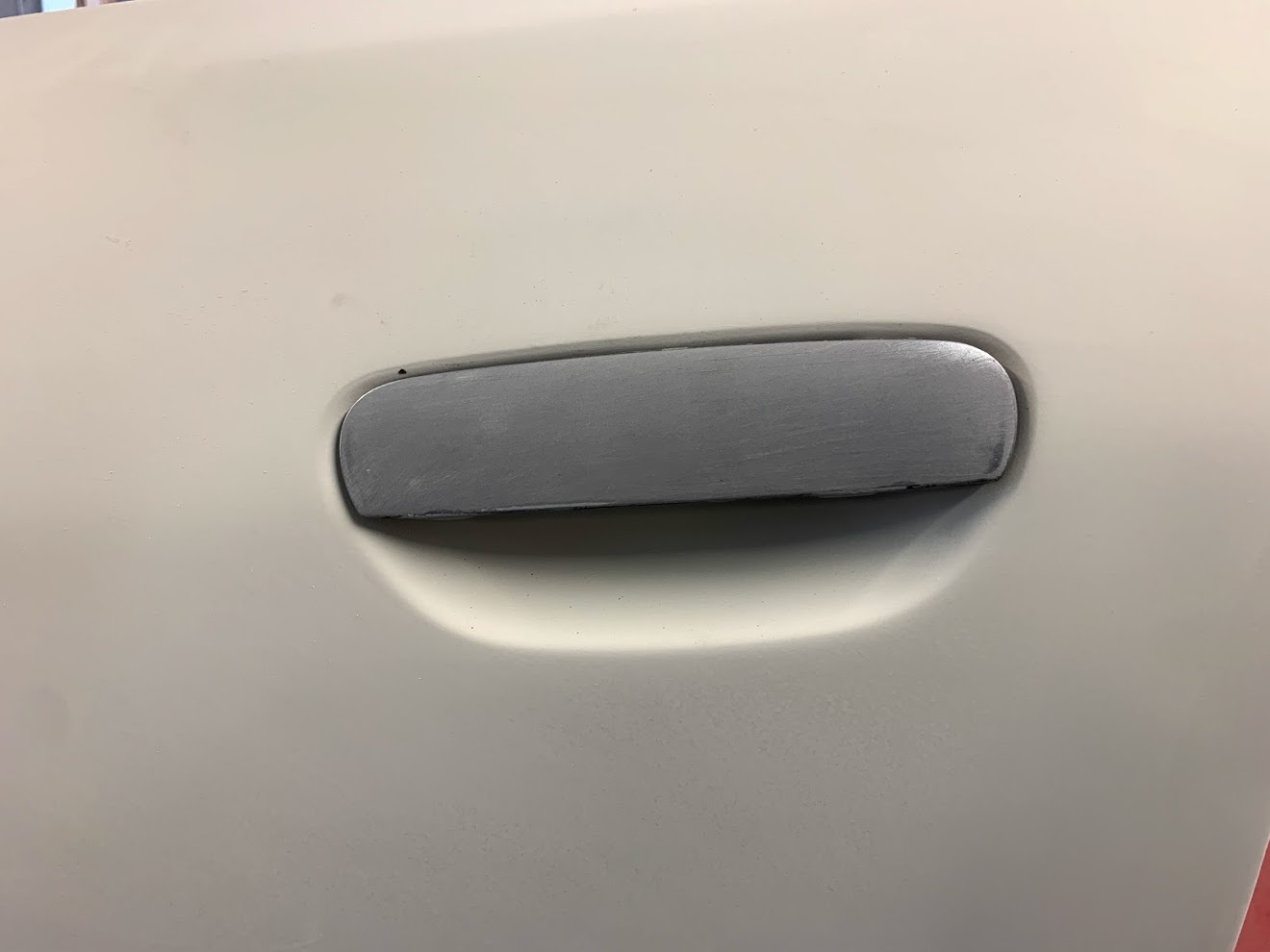 Ovenkahvoja hinkatessa ja modatessa meni koko päivä. Halusin laittaa kuskinoveen pitkän ovenkahvan niin kuin muissakin ovissa. Siinä on normaalisti lyhyempi koska siinä on lukkopesä. Laitoin jo takakontin lukkopesän reiän umpeen, joten en halunnut hävittää viimeistäkin lukkoa joten piti keksiä jotain. Hioin kahvan runkoa matalammaksi lukkopesän ympäriltä niin että sen päälle sopi pitkä kahva. Vahvistin runkoa alapuolelta kemiallisella metallilla. Lisäksi kahvan pinnan toinen kiinnityslenkki on eri kohdassa lyhyessä ja pitkässä, joten keksin tehdä nekin kemiallisesta metallista. Ne on muutenkin sellaisia että hapettuvat ja ne alkaa heilumaan koska kiinnityslenkki katoaa.
