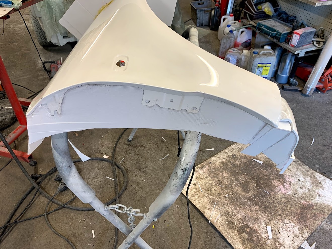 Vihreää puskuria varten tein kuidusta muotin että sain tehtyä hiilikuidusta puuttuvan palan. Ja harmaata puskuria varten tein toisenlaisen muotin jolla sain kohdistettua uuden palan tarkasti oikeaan kohtaan. Satuin kerran ostamaan eBaysta RS4 puskurin päädyt, siitä on aikaa yli 10 vuotta ja nyt yksi niistä tuli tarpeeseen! :)