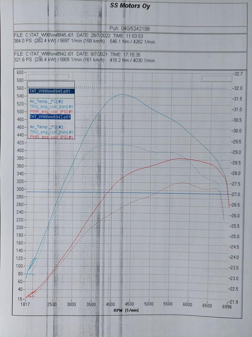 4000rpm maksimi vääntö - 1.2 bar vakiona - 1.5 bar muokattuna / 420nm vakiona - 540nm muokattuna