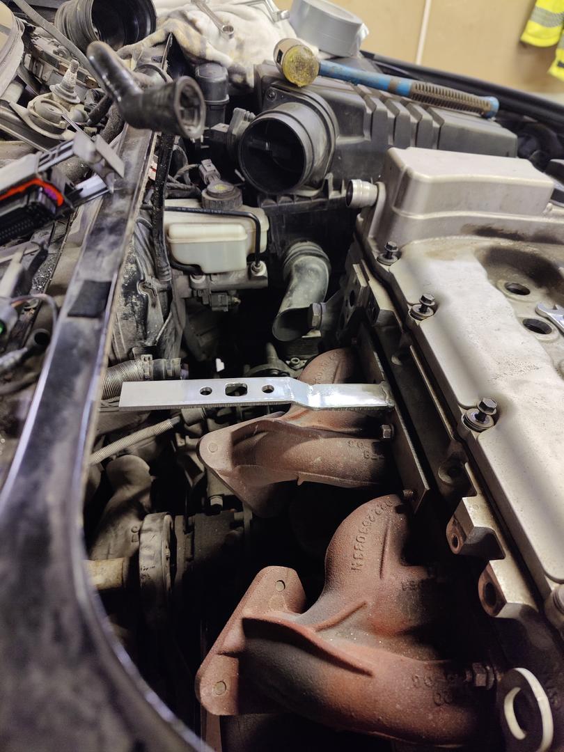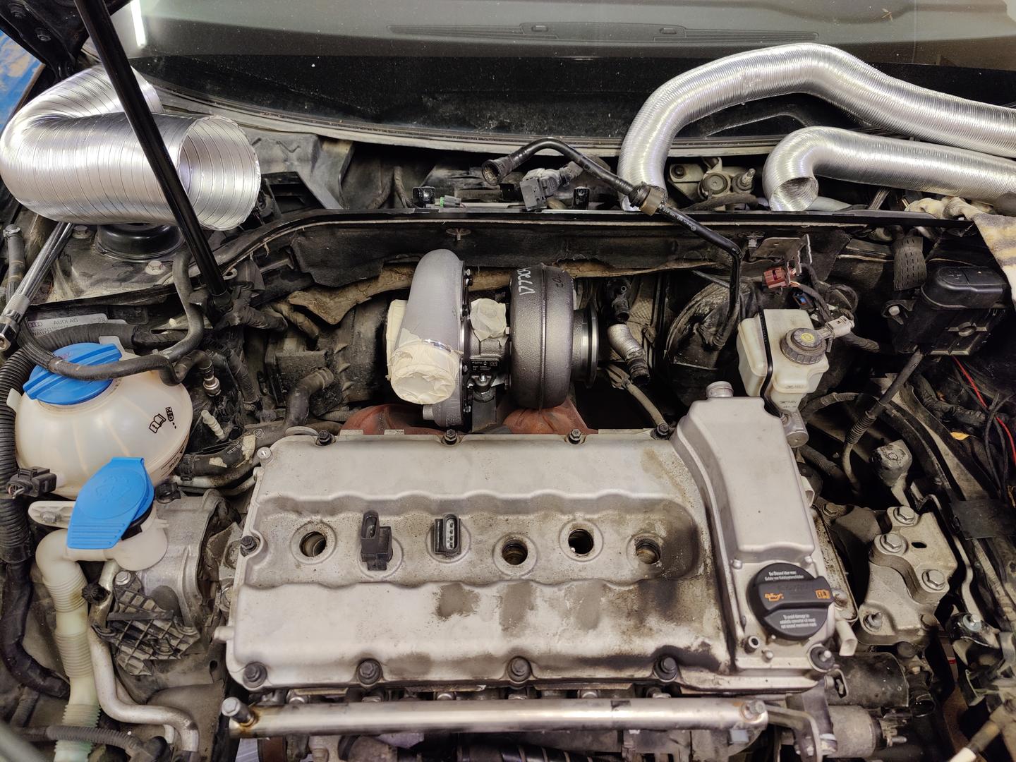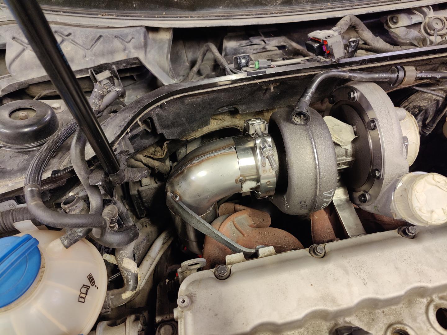 Tarkoitus on tukea ahdin kiinteästi moottoriin ja tehdä putket joustopaloilla. Alapuolen tukirauta öljynpaluun reiällä on valmiina ja kestää kannatella ahdinta paikallaan. Laitoin Marteliukselta tulemaan 3.5":n downpipe-osia ja nyt odotellaan niitä. Heppaillaan downpipe kohdilleen ja sitten voikin ottaa moottorin pois ja sovitella vielä tulossa olevat hukkaportit sekä kaikki muu kuuma puoli moottori lattialla kohdalleen.