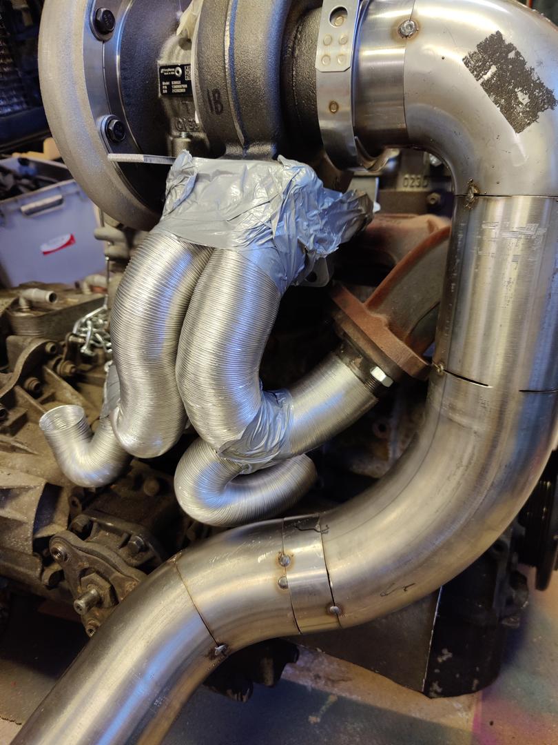 Öljynpaluu tuli myös heppailtua kasaan, kun vaihteisto oli irrotettu ja sain jakopään kopan irti ja letkulähdön paikalleen. Päälle tuli Dunlopin Pyrojacket ja lämpösuojia pitää vielä rakennella myöhemmin. Tuolla on jatkuva lämmönkesto +260 °C, 15–20 min. +1090 °C ja 15–30 s +1650 °C. Joten luulisi kestävän ihan hyvin.