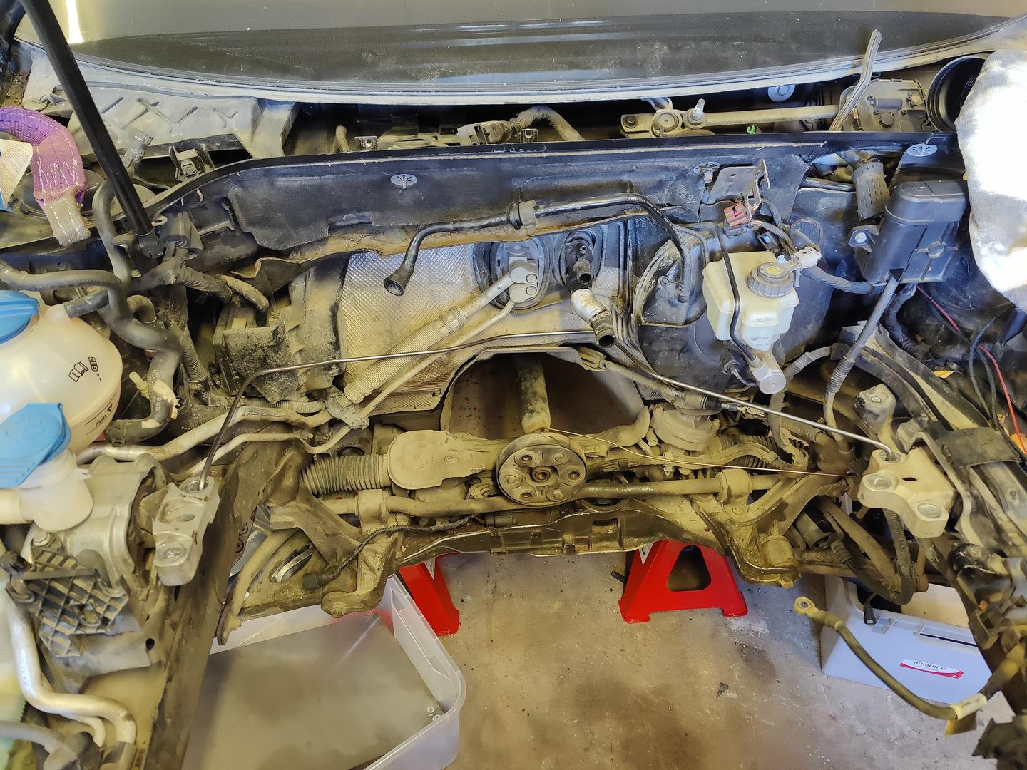 Osa romuista tulee ensi viikolla ja osa toivottavasti seuraavana, joten moottorihommat odottaa nyt mäntiä. Otin samalla uuden lauhduttimen keulalle, kun oli sen verran hakkautunut alareunasta umpeen ja samalla voi sitten ottaa keulankin kokonaan auki, niin on helpompi asennella moottoria.