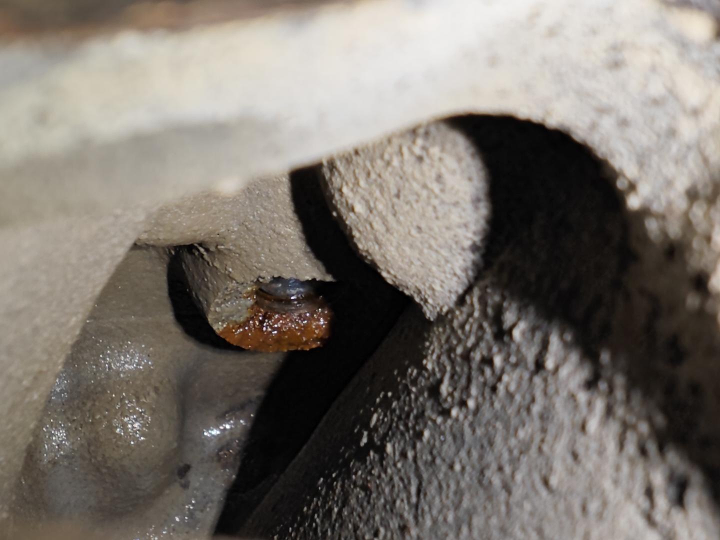 Löytyi vahingossa myös "termostaattikotelon" vuoto, kun kääntelin moottoria pukissa ja katoin, että mitäs tuossa öljyrätin päällä moottorin alla on. Siellä on tainnut edellinen asentaja koittaa vähän ylipitkää pulttia. Onneksi ei tuon pahempi ja saa pinnapultilla ja liimalla kuntoon. Aika harmaa pintahan tuossa on, joten on tainnut poksahtaa irti jo aikoja sitten.