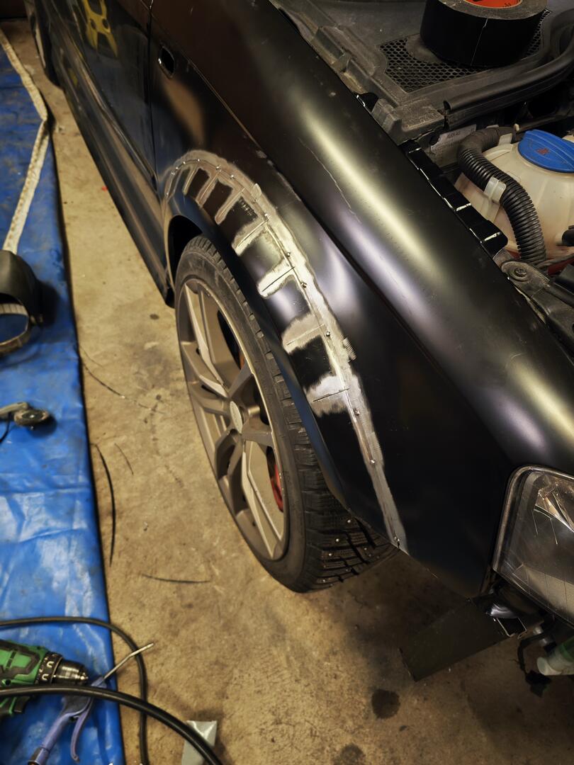 Lokarit ja konepelti tuli maalarilta. Lokarien istuvuus ja raot eivät ole ihan parhaat. Vähän on halpislokarin makua ja hitsauskin on vedellyt vähän, joten tarvitsee hieman voimaa laittaa niitä kohdalleen. Mutta mitoitus muuten aika just eikä melkein noille pyörille.