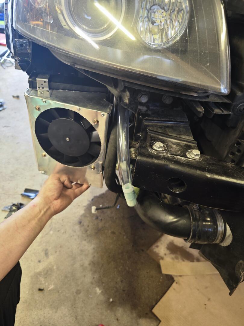 Alkoi taas leikata sen verran kiinni, että revin koko paskan sieltä pois ja palautin kaiken tehtaan malliin lämmönvaihtimineen. Laitoin lämmönvaihtimelle oman pumpun ja käytin öljynjäähdytintä veden jäähdyttämiseen. Normaalisti lämmönvaihtimen läpi kiertää moottorin jäähdytysvesi, mutta lämpöjen noustessa riittävästi, suljetaan moottorikierto ja kierrätetään vettä vain lämmönvaihtimen ja jäähdyttimen kautta. Tilaahan on laittaa vähän letkuja, yksi pumppu ja kolmitieventtiili. :D Laitoin vielä puhaltimen ja vähän ilmanohjaimia. Sielläkin on niin hyvin tilaa, että lopullista puhallinkoteloa piti vähän kulmasta hakata ja puskurista leikata pieni pala pois sumarin kohdalta. Sumarin liitinkin on ehkä 5 mm:n päässä kotelosta. Nyt näyttäisi ilma menevän ajossa jäähdyttimen läpi ilman mitään kanavia puskuriin. Laitoin jäähdyttimen veden paluuseen lämpöanturin, niin näkee tuon toiminnan hyvin mittaristosta. Öljynpaineetkin on korkeilla öljylämmöillä vielä ihan kohdallaan. Toivottavasti tämä homma loppuisi nyt. :D