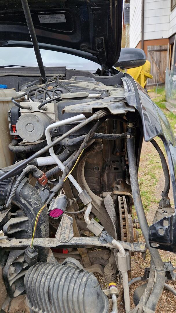 Osien haaliminen tuli aloitettua jo silloin about saman tien päätöksen jälkeen. Hain eräästä saman värisestä, sen kaupanpäälisinä saadun palkin lisäksi, 1.8T manuaalista valot telineineen, puskurin, maskin ja radpackin kaikkine kennoineen. Moottorin jäähdytyskenno pitää toki hankkia uusi, koska S-Tronic. Manuaalin kennosta puuttuu laatikon linjat. Myös parkkitutkat pitää siirtää. Maskin paikat on helppo vain tökätä ripojen väliin, mutta itse kuoreen joutuu kairaamaan reijät.