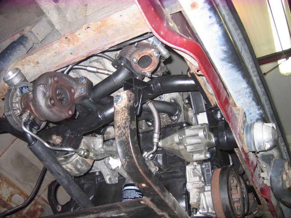 Tässä matkan varrella on muunmuassa apurunkoputket muuttaneet muotonsa niin että vitonen istuu konehuoneeseen. Moottorin ja vaihteiston välissä on eteläafrikasta kotoisin oleva kytkinkoppa ja 220v kytkin kaikkineen. T3:a siis on tehty Afrikassa vitosella. Kytkintyösylinterin teline on omavalmiste.