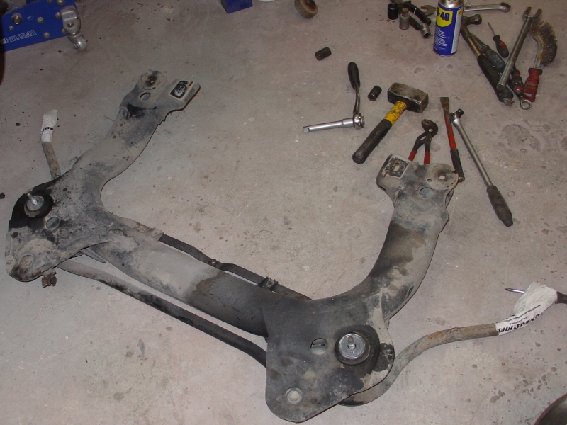 Apurungon etureunassa oli jotain piuhoja ja putkia kiinni, kannattaa irrottaa ne etukäteen ettei riko mitään (siinä vaiheessa kun apurunko roikkuu niiden varassa!). Vaihdelaatikko on kiinni apurungon takapäässä, se kannattaa tukea erikseen. Apurunko sinänsä on onneksi aika kevyt käsitellä.