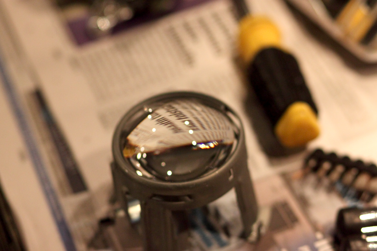 Alla muutama kuva aiheesta. Pesuun käytin ihan astianpesuainetta. Linsseille vain huuhtelu ja talouspaperilla pyyhintä, laseille tiskiharjaa. Pitkien peiliä pyyhkäisin hyvin varovasti paperilla. Pinnoite näytti olevan hyvässä kunnossa. Hyvinkin suositeltava operaatio kaikkinensa, vaikka niitä kaasupurkausvaloja olisikin laittelemassa.
