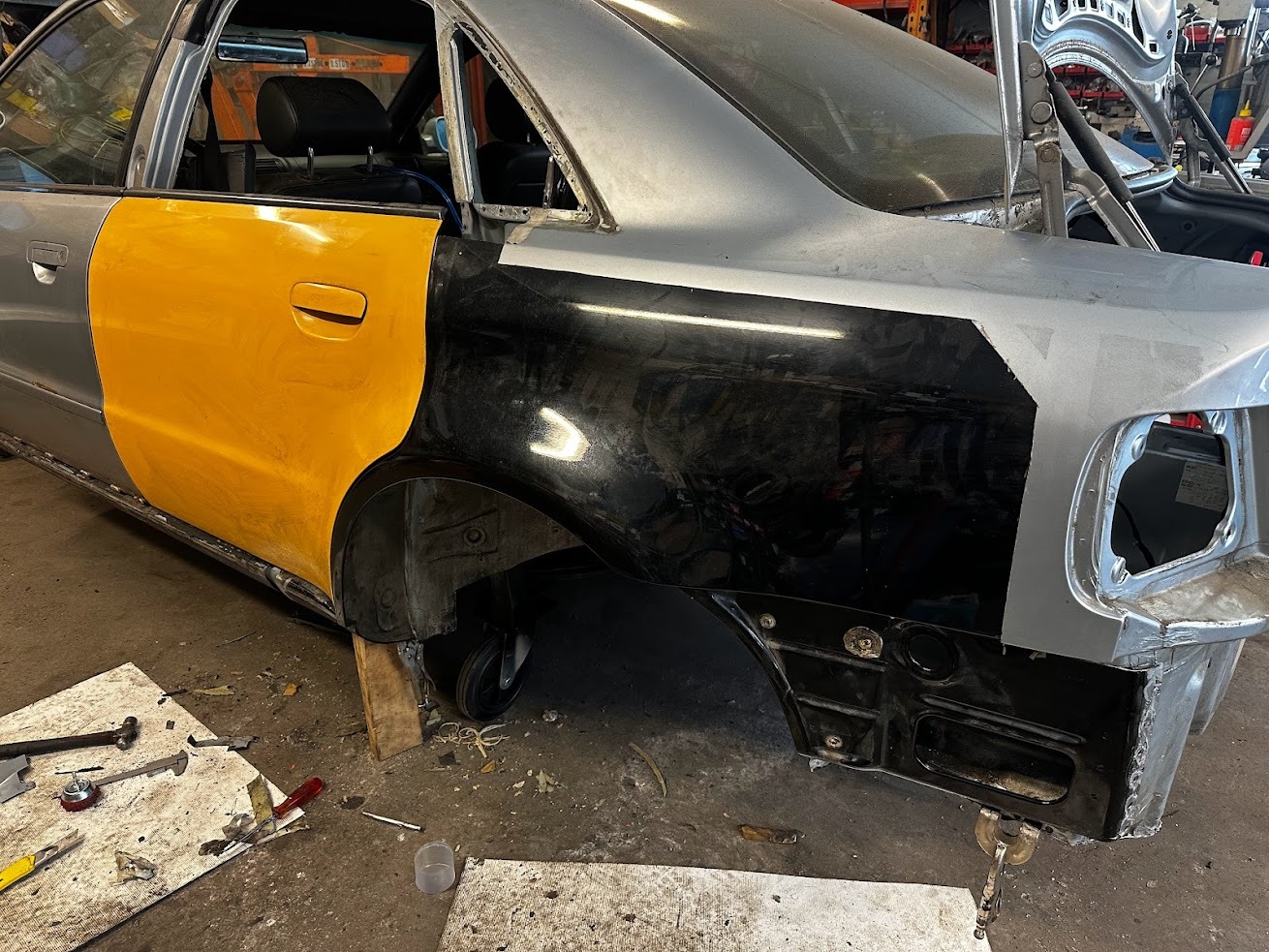 Otin ensin pintapellin irti että pääsin irroittamaan peltien välissä olevan pellin ikkunan alareunasta. Se on erilainen Avantissa ja sedanissa, joka teetti paljon miettimistä että miten sovitan sen Risan lokarin sisään. Sitten vaan sisäpuolen kimppuun. Muutama pistehitsi oli todella piilossa ja hankala kaivaa esille.