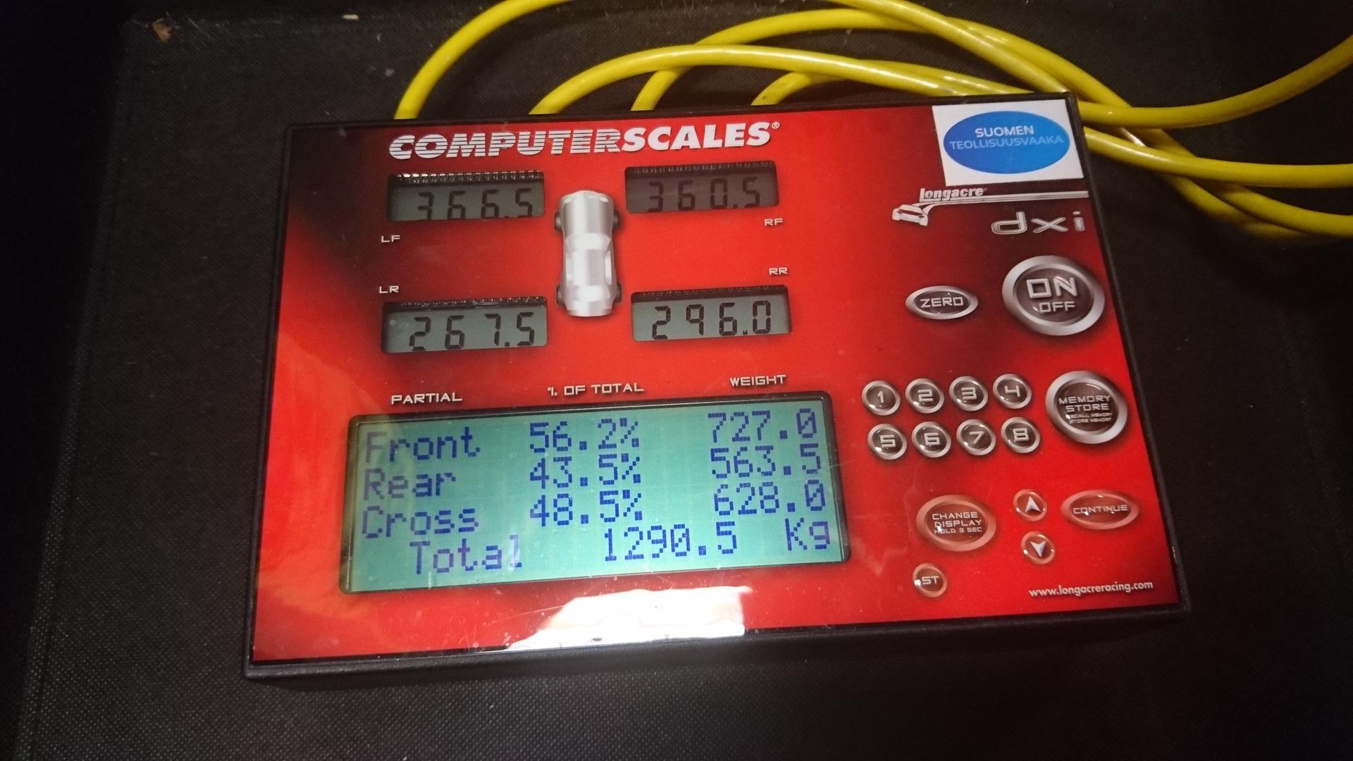 • 1:0.5 :) oisin odottanu alle 1250kg. Laseissa ja akussa nyt vielä on 30kg. Tankki täynnä. Unohtu hyppiä takapään päällä tunkin jälkeen. Mitä jousia tähän nyt lähetään hakemaan?150eteen 130taakse. Onko sinnepäinkän? Tuossa ei vielä säädetty mitään. Saatin vain painot