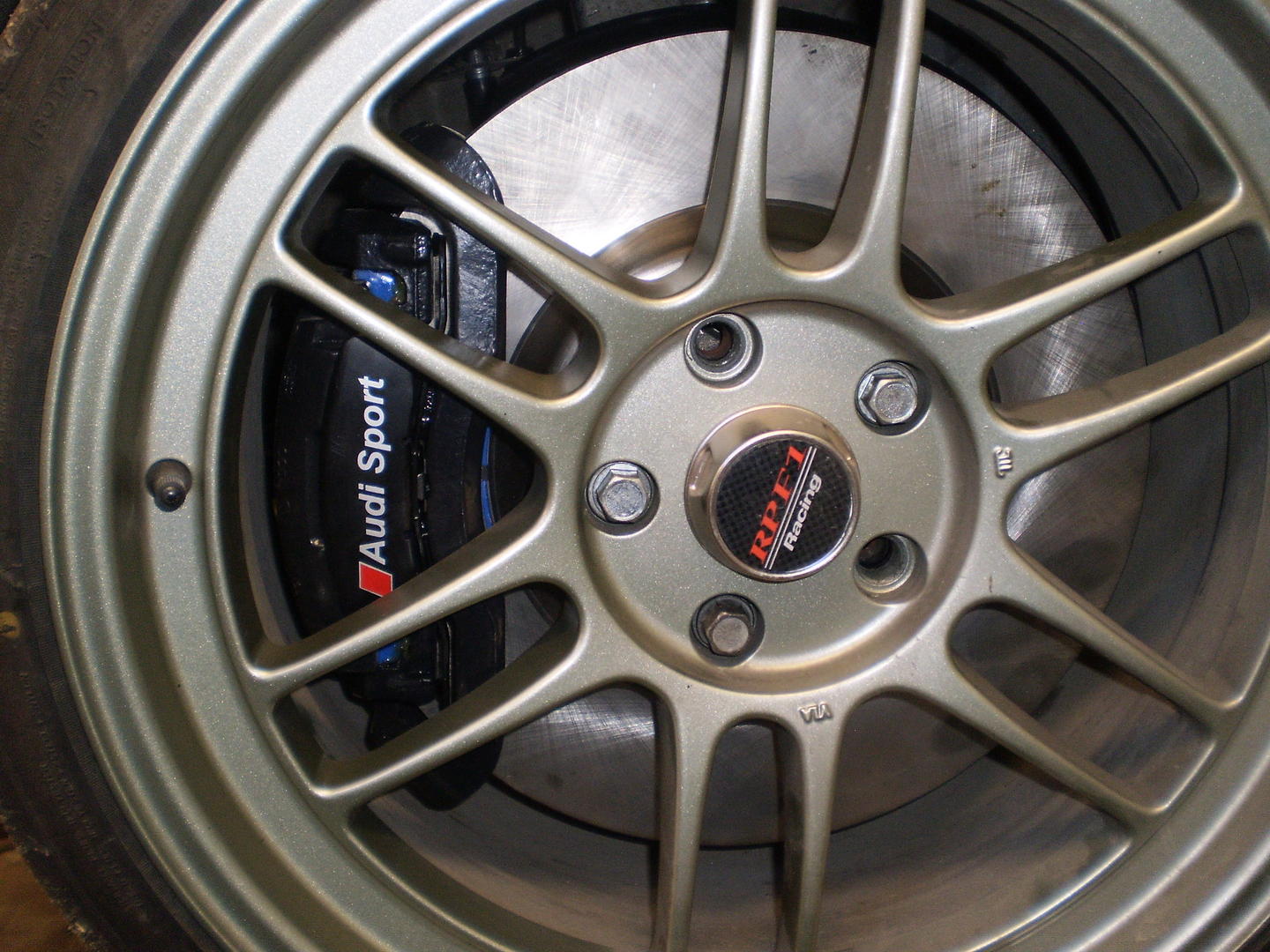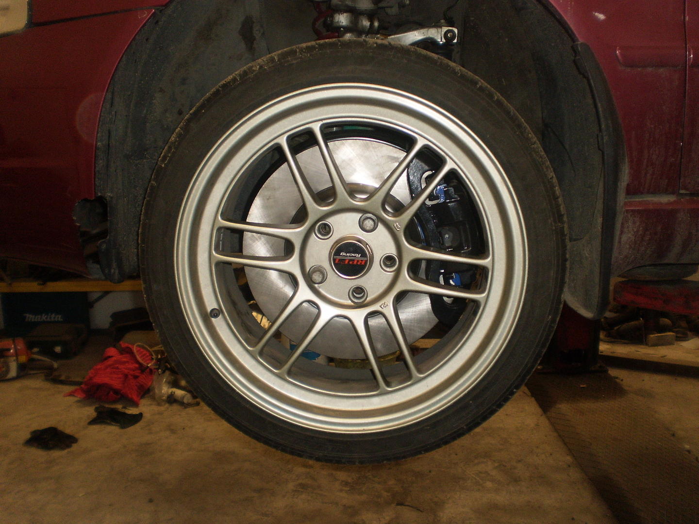 • Etujarrut on nyt kokonaan paikallaan. 3mm spacerin kanssa jää 1mm satulan ja vanteen puolien väliin. Eli nyt on edessä 9x18" ET32, 225/40 kumilla. Etuolat eivät olleet valultaan ihan identtiset vaikka ovat kumpikin samasta autosta. Piti vähän hioa että jarrukilpi asettuu kunnolla eikä hankaa levyyn.