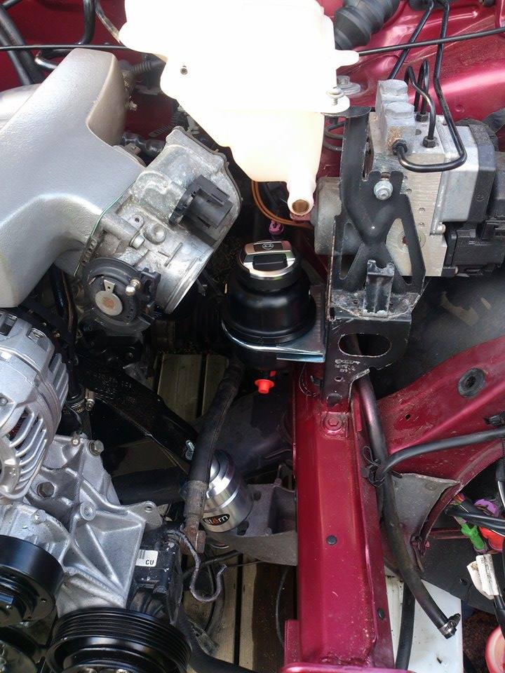 • Huohotinpönttöä sovittelin konehuoneeseen ja tulin siihen tulokseen että alkuperäinen ruma tehostimensäiliö saa väistyä omalta paikaltaan. Harmittavan rumalla R8 audin korkilla varustettu säiliö tulee siis käyttöön. :)