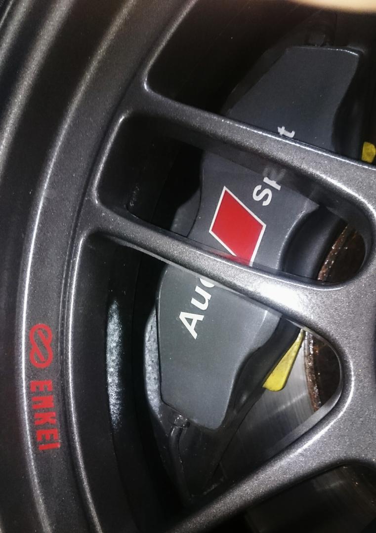 Viime syksyn säätöhommissa kun kokeiltiin noiden RS3/TTRS brembojen tarttumista täysjarrutuksessa, niin keula niiaili jonkun verran ja perä tietenkin alkoi "leijumaan". Paloina on EBC yellow stuffit ja levyinä ihan halvimmat B6/B7 S4 345mm tarvikelaikat.