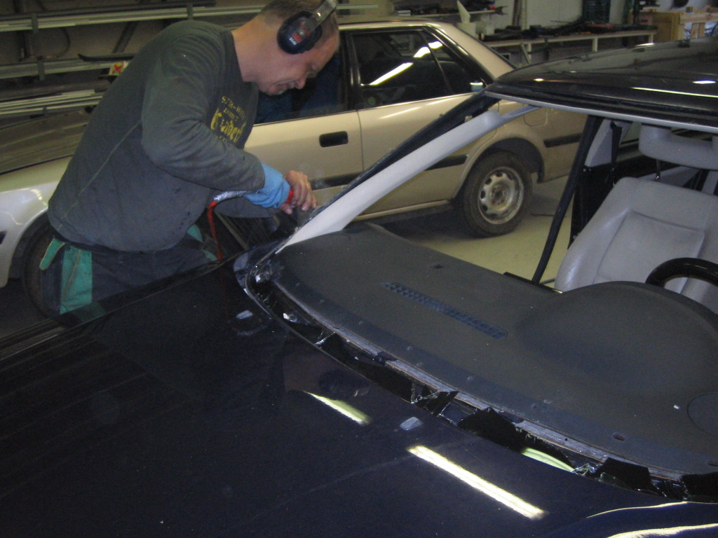 Voin kertoa että 17v paikoillaan ollut tuulilasi todellakaan halunnut lähteä paikaltaan. Lievää voimakkaampaa väkivaltaa jouduttiin käyttämään ennenkuin irtosi. Oli guntterit laiimanneet lasin muuten tosi hyvin ja tarkkaan koriin kiinni, voisi sanoa että tuulilasi oli osa koria. Alla muutama kuva operaatiosta. Multa saa neuvoja jos/kun homma tulee jollekulle ajankohtaiseksi. Siinä on muutamia juttuja, joita ei ehkä heti tule ajatelleeksi, tietty jos omistaa korjaamokäsikirjan sieltä ne löytyy.