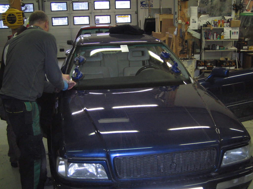Eilen "heitettiin" paikoilleen uusi tuulilasi. Siis niin sen olisi kuulemma pitänyt käydä, ei ollut niin helppoa. Olisko menny kolmisen tuntia ennekuin uusi lasi oli paikoillaan, ja siitä vielä pari tuntia ennen kuin pääsi ajoon.