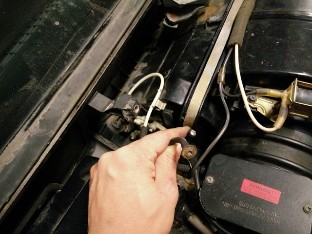 Piti sitten alkaa metsästämään mistä se roiskiin jäähdytinnestettä ulos. Sitä kun tulee melkoisesti. Äkkiähän se löytyi kun otti suojamuovin pois ilmastointi yms. laitteiden päältä. Nestettä tulee tuosta ilmausruuvin kohdalta (kuva) ja sitä tulee paljon kun auto käynnissä. Kuvasta näkyy, että autoon on ilmeisesti aikoinaan vaihdettu kenno sillä tuon boxin alla on joku tiivistematon tapainen. Tepolta on tulossa ihan oikea tiiviste tuohon eli pitää nin kuitenkin repiä tuo boxi pois ja vaihtaa varuilta kenno ja puhaltimen moottori uusiin.