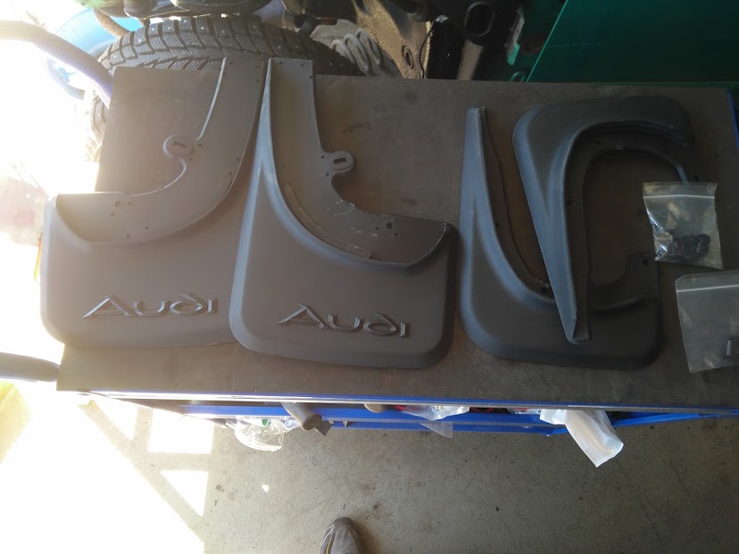 Ai niin, hommasin autoon tehdyt roiskeläpät. Hiukan mallailin paikoilleen ja kerrankin voi sanoa, että nuo todellakin sopii autoon aivan suoraan. Ei tarvitse muuta kuin ruuvata kiinni =)