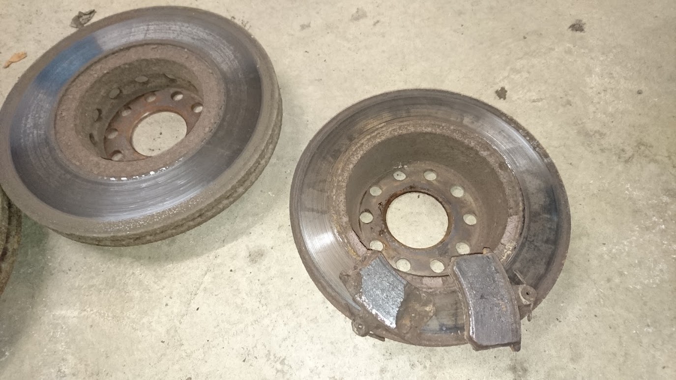 Takana liuku-osat aivan jumissa. Niissäkin meni tunti jos toinenkin, että sai irti. Kuskinpuolen toinen jarrupala mielenkiintoisen näköinen (kuva). Edessä palat loppu ja se selittää välillä vilkkuvan keltaisen jarruvalon mittaristossa. Levyt on pahasti hapettuneet. Etulevyistä saattaa saada vielä kohtuulliset ja laitoinkin ne happokylpyyn ja katsotaan mitä sieltä tulee.