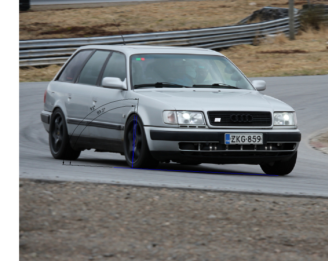 • Tein pienen kuvamanipulaation aiheesta. Tuo 89,5 asteen viiva kuvaa tilannetta nykysetupilla. Eli tuossa mutkassa sulla rengas kääntyy positiiviselle camberille 0,5 astetta rataan nähden. Ei siis ihme että kumi taittuu alle.