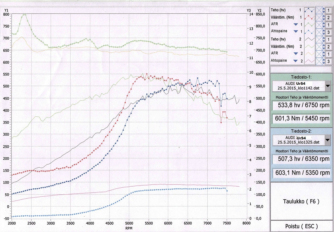 Ilmeisesti monet ovat olleet pettyneitä(juu olihan se :D) ku ovat käyneet Ranacon penkissä ku ei tuu samoja lukemia ku muualla, kuulemma mukaan väännötkin tulee paljo alemmat, joten voi olla perää et näyttää reilustikin vähemmän..? Kuten omistaja totes vähintään 50hv vähemmän mitä esim. Motorsetilla. Mulle jäi nyt remmin kanssa 507hv/601Nm. Siitä jos ajatellaan et noi remmihilut/läppä kuristaa sen ~45hv ja jos tää dyno näyttää vähintään 50 vähemmän, niin ollaan jo aika lähellä viimevuotista tasoa, 609hv, tai siis mennään ehkä oikeilla linjoilla. Vääntöjä oli toki muikeat 764Nm. Nyt ajettiin 2,3 baarilla, viime vuonna 2,5:llä. Eri dynojen tuloksia on vähä hankala suoraan verrata.