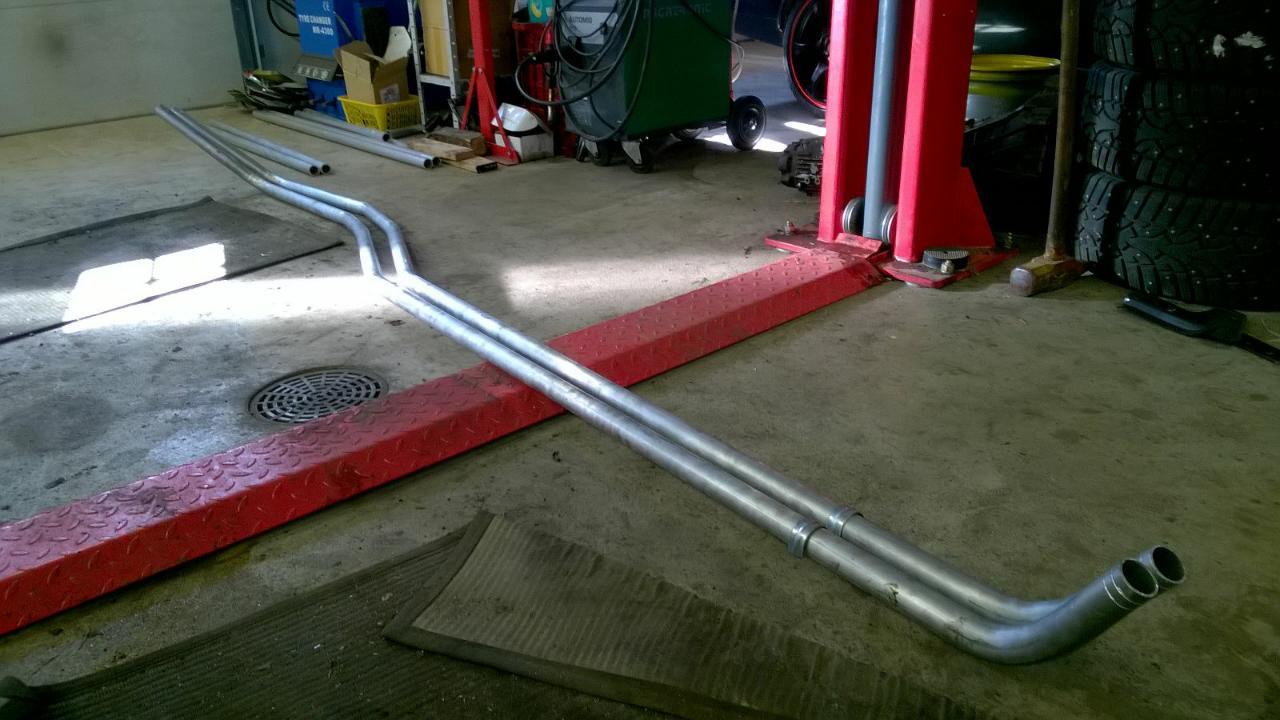 No niin, ehkä takajäähdytinasennuksen hankalin vaihe on nyt suoritettu. Kiitokset PKK teamin Teemulle avusta ja nosturin lainasta. :) Elikkäs pohjan vesiputket ovat nyt paikalleen taiteltu ja asennettu paikoilleen. Hieman oli hankala toi pakoputken ylitys ja siihen joutuu jotain käärettä tai suojalevyä tms. vielä laittamaan. Toki hankaloittaa myös putken irrotusta, mutta eipä oikein voinu muuta. Ehkä versiossa 25480 sitten laitetaan putki kyljestä pihalle..? :D