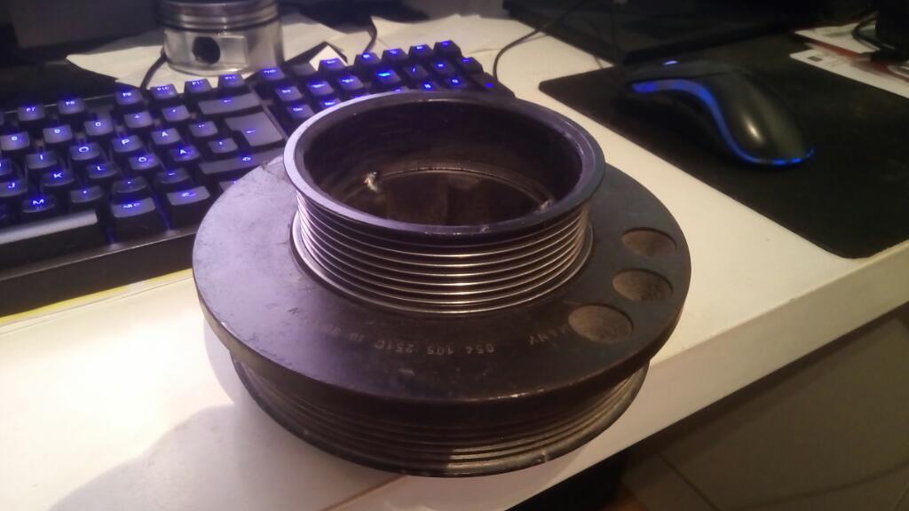 Damperi tuli hitsailtua. Muutama piste sinne tänne ja välissä paineilmalla jäähdytellen. Täytin myös noi ulkokehän isot tasapainotusreiät, ku tämä oli joskus tasapainotettu jälkikäteen, mut kampura tulee nyt tosiaan ihan tasapainottamaton. Eikä muutenkaan oo hajua onko tän damperin kampurapari missäpäin menos, saatikka edes hengissä..?