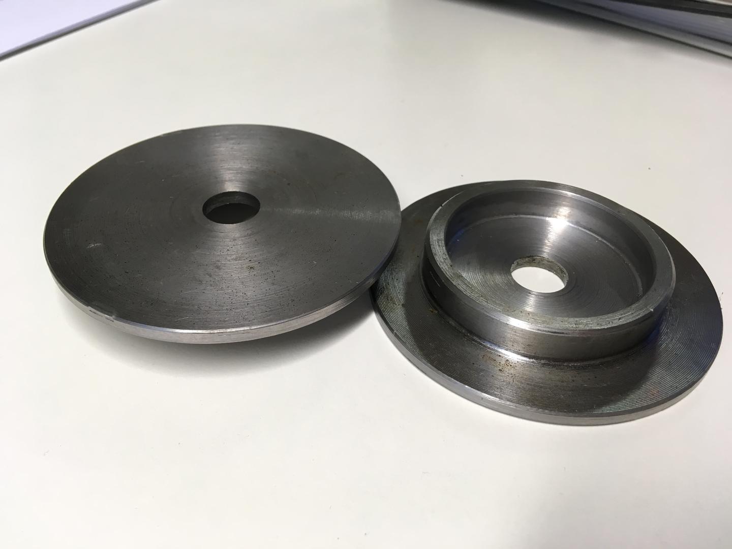 Ohessa havainnollinen kuva selventämään edellistä sepostusta, josko tästäkään nyt apua. Yläjousilautaset siis modattu 100 —> 85 mm ja jousen keskitysholkki (sisähalkaisijalle) tyhjennetty ylimääräisestä aineksesta. Jälkimmäinen oli sikäli hyvä, että se kevensi lautasia samalla, kun tekee lisää tilaa iskarin varren yläpäähän. Nyt lautanen uppoaa pidemmälle (9 mm) iskarin varteen, mikä on suoraan lisää korin päässä ulos työntyvää osaa. Tästä seuraa se, että iskarin päästä saa kiinni paitsi yläpään mutterin kiristystä varten, myös säätö onnistuu.