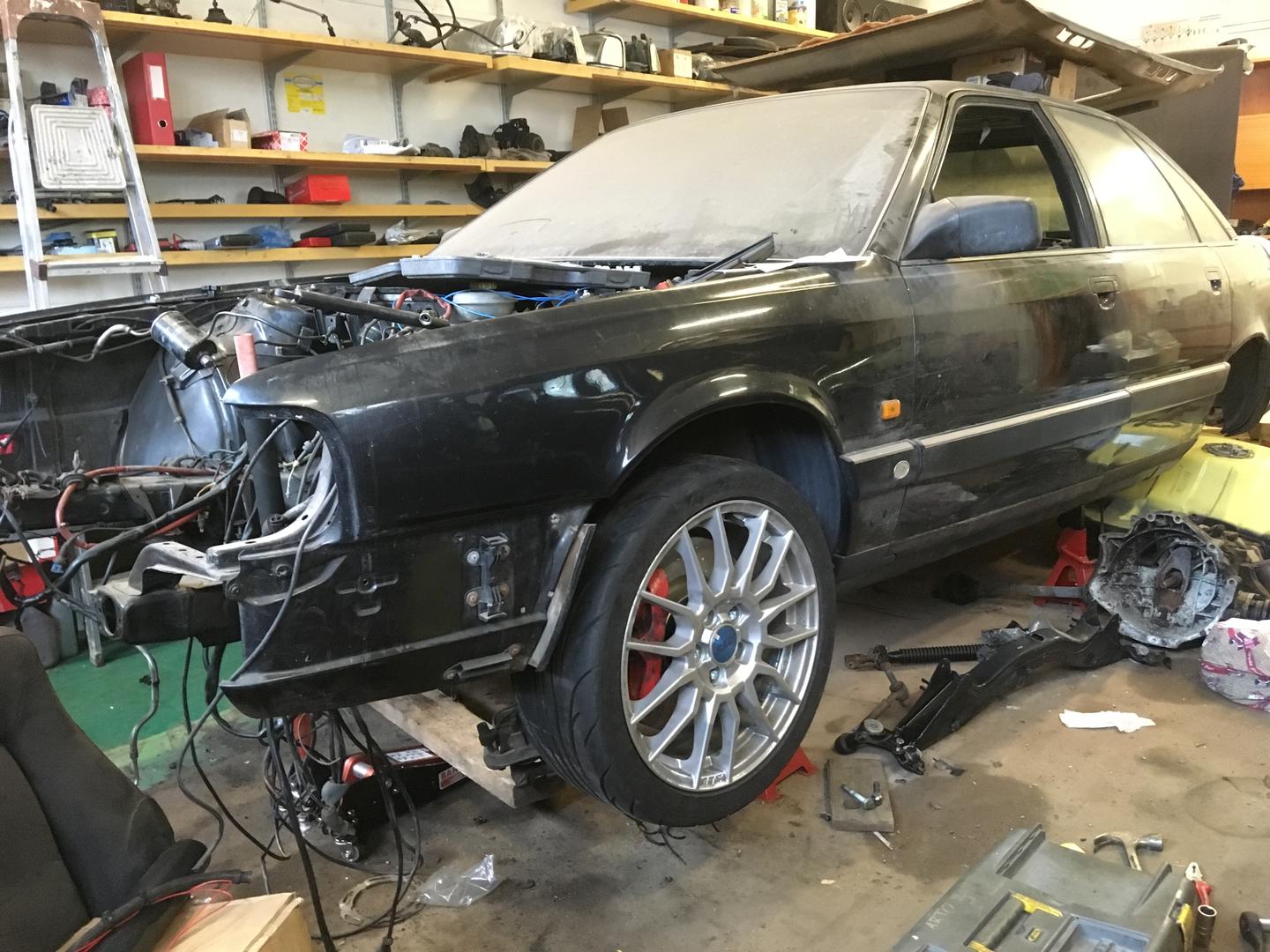 Keulasta alustan osat nipussa ja perä kasaantumassa. Tankin kanssa sai vähän painia. Letkujen paikka oli vähän tarkallaan, eikä yksin temuaminen ollut varsin hauskaa. Eteen tarvii hommata abs-anturien asennusholkit.