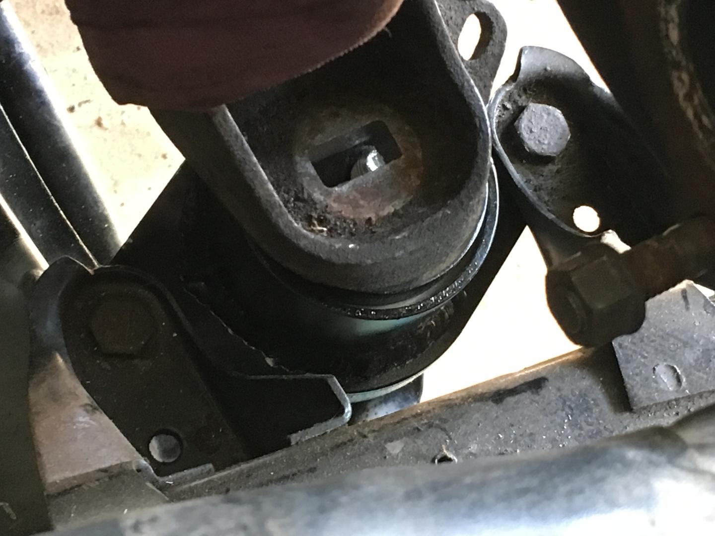 Paketti oli jo hyvää vauhtia käymässä taloksikin, mutta jäykempien moottorin tukityynyjen mukana tulleista pulteista toinen on liian iso moottorin korvakon reikään. M12 pultti ei mahdu läpi vähän yli 11 mm kolosta. Ei auta kun avartaa. Eikä muuten ollut varsin voittaja fiilis huomata asia, kun koko noin 300 kg paketti roikkuu tyynyn päällä. Ei se auttanut, oli pujoteltava pois. Onnmuuten yksikseen tehden aika epämiellyttävää puuhaa, varsinkin kun auto on pukeilla, eikä tukevasti pyörillään. Yhden asentoa piti jo hieman korjailla, ettei päässyt putoamaan.
