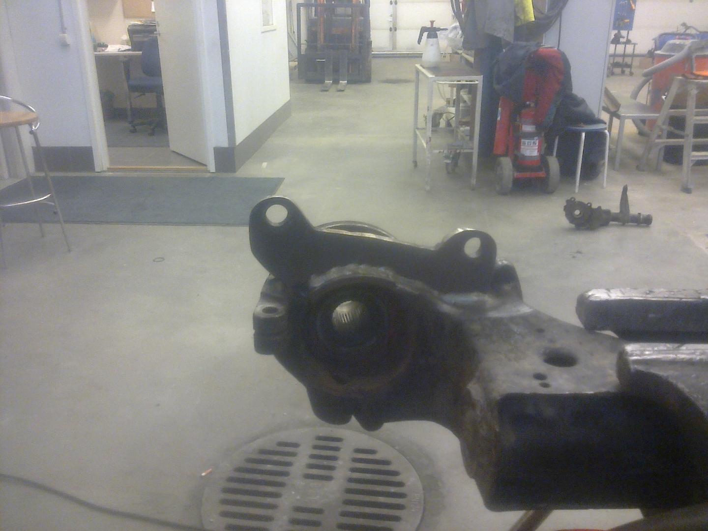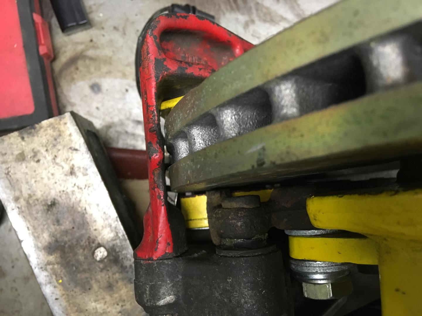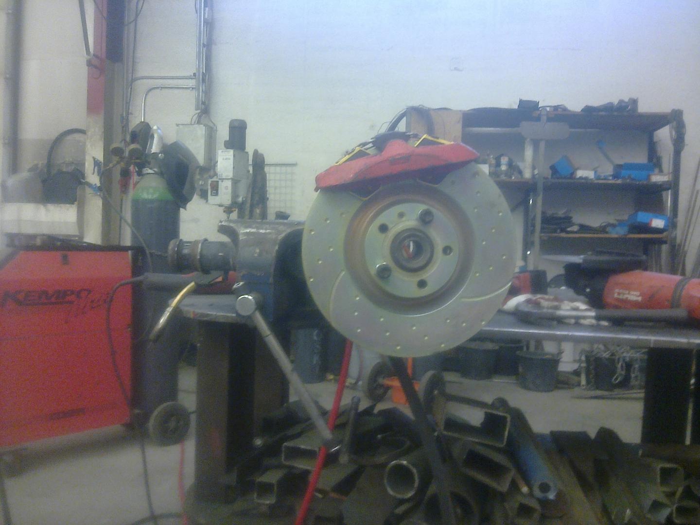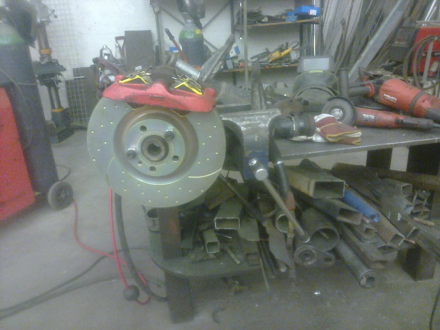 Kouvostoliiton herrat askartelivat etutolpat valmiiksi. Varret on siis kierteytetty ja jarrusatulan kiinnitys modattu siten, että satula istuu suoraan tolpan kiinnitykseen ja asettuu 345 mm levylle. Tolpat ovat alunpitäen C4 A6:sta, sellaiset kun sattui ylimääräiset löytymään. Jousilautaset on mitoitettu 57 mm jouselle, joka mahtuu juuri ja juuri iskarin mutterin yli. Jos tuon kanssa alkaa ilmestyä ongelmaa, pitää vaihtaa 65 mm jouseen ja hommata isommat jousilautaset.