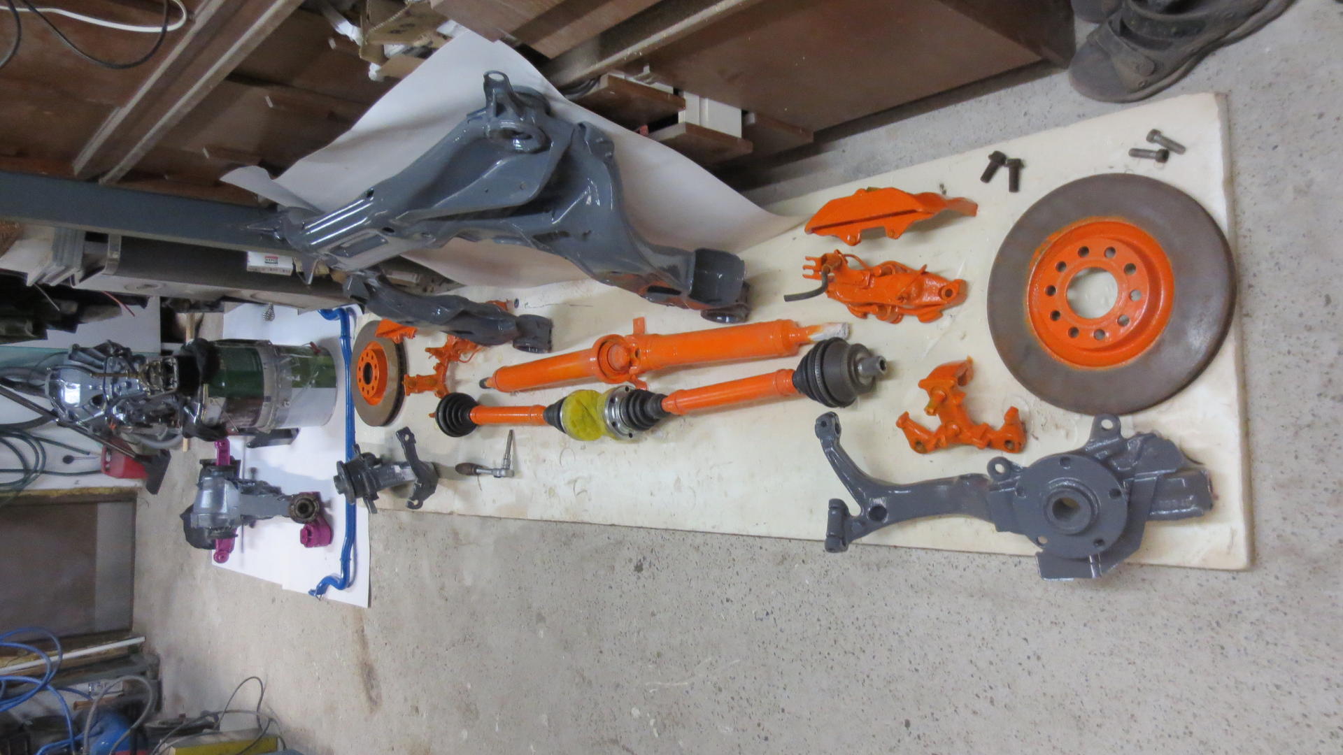 Projektia pikku hiljaa näperelty, etunilkat, jarrut puhallettu. Apurunko, etuvetarit ja kardaani viety ammattilaiselle puhallutukseen, minun laitteilla ei meinannu apurungosta maali lähteä. Vaihteisto ja perä liuotinpesty. Kaikki murrokset putsattu vanhoista rasvoista, väljät uusitaan, kuten myös laakerit. Jarrut on jo koemaalissa.