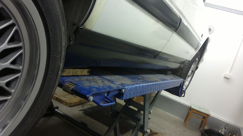 Pikkuhiljaa koittanut tehdä valkoista V8:a kesäkuntoon. Helmat saivat pintaan uutta maalia, kun vanha pinta näytti kulahtaneelta mustalta. Irtoroskat pois pinnasta ja puhdistus, sen jälkeen mastonin musta "smooth finish" kaksi kertaa. Pensselillä maalasin ja pinnasta tuli tasainen ok pinta. Toivottavasti helpottaa puhdistusta jatkoa ajatellen.