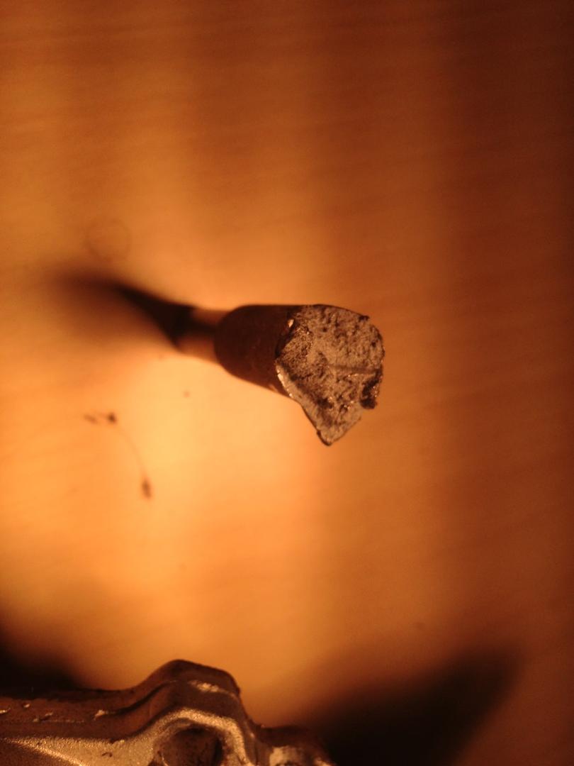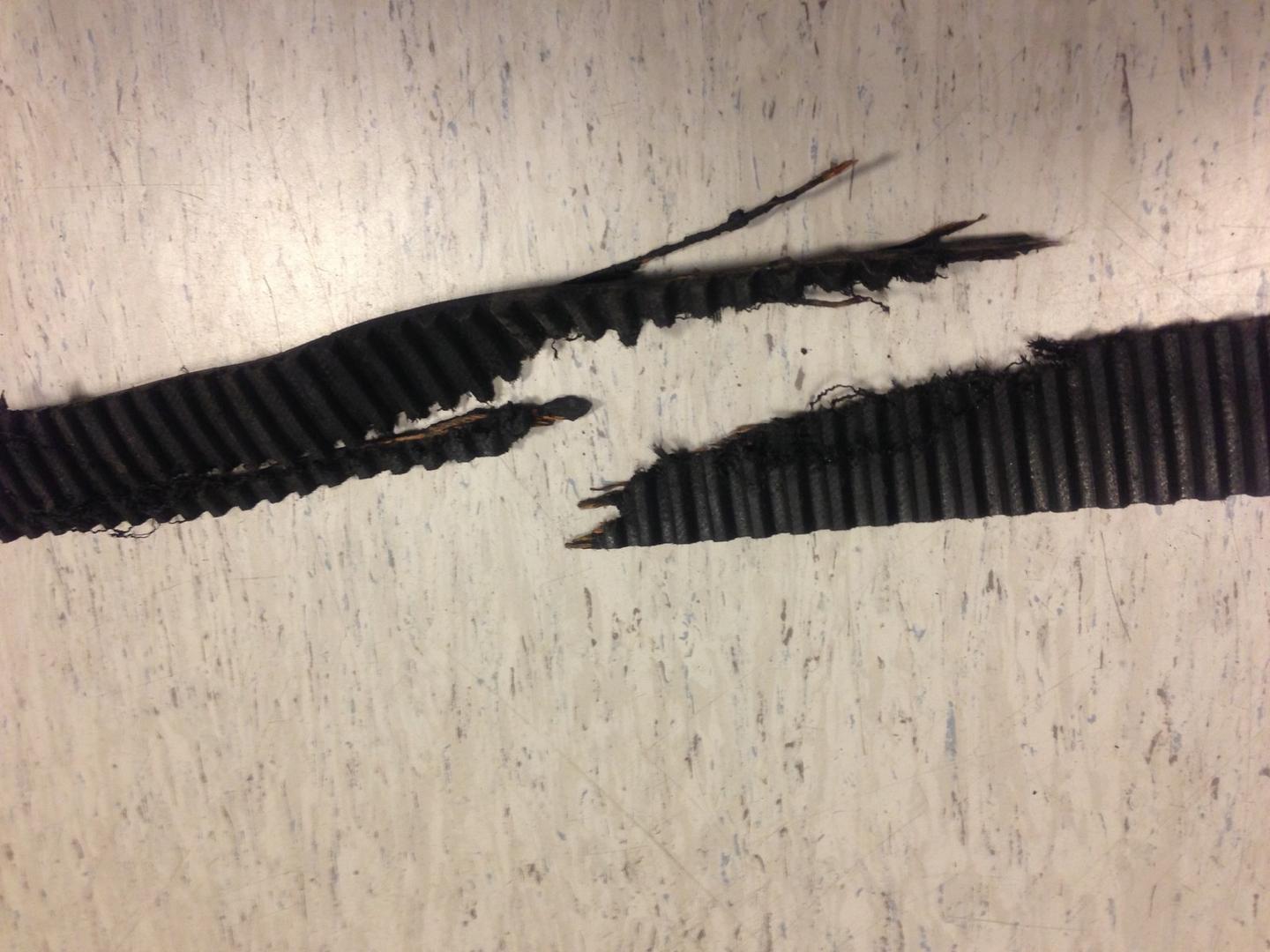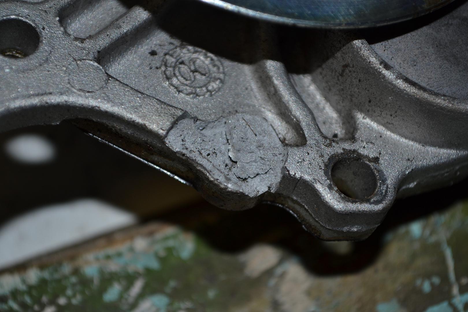 Niin, kyllähän tuo nyt vaan näyttää tuon tapin osalta olevan seurausta hihnan hajoamisesta, murtumajälki näyttää minun silmään voimasta revenneeltä. Tuollaista röpelöä siitä taitaa sillon syntyä. Tapissakin näkyy myös musta jälki johon hihna on ehkä napannut? No toistaalta se jälki on voinut tulla myöhemminkin. En tietenkään ole mikään metallurgian asiantuntija, joten pelkkää mutuilua.